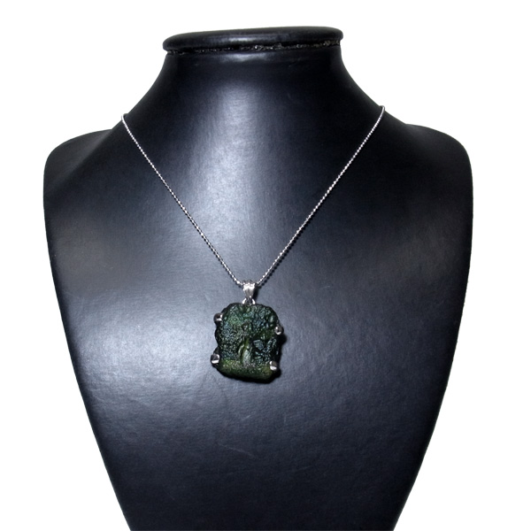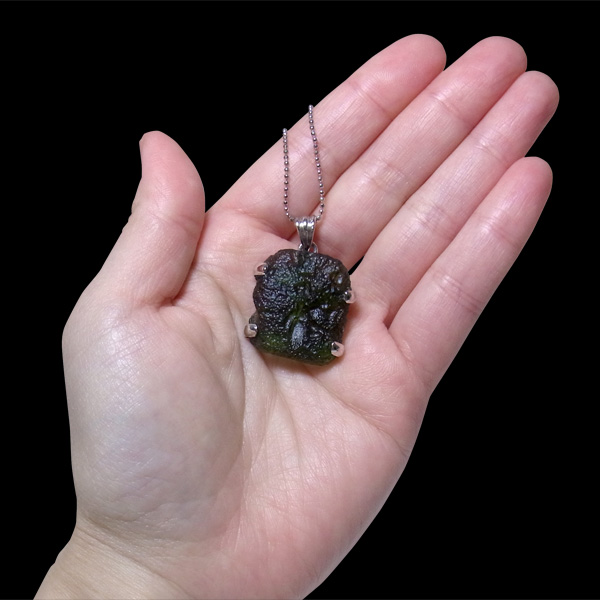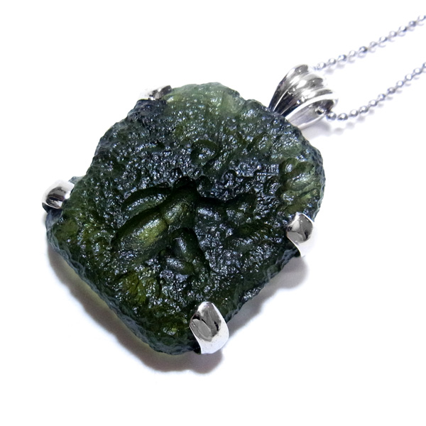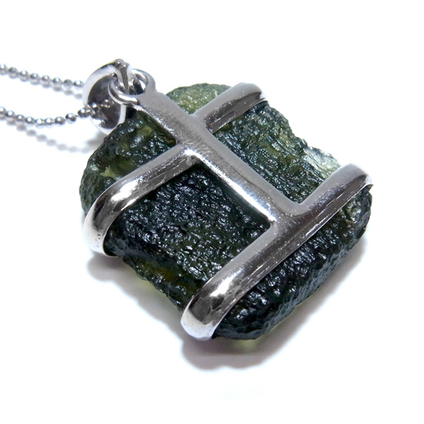 隕石の衝突によりできた天然ガラスとして知られるモルダバイトの原石型ペンダントトップです。貴重な大きなピースを使用しております。モルダバイトは、隕石が落下した際に起こる膨大な熱量と衝撃によって、地上の物質と隕石の成分が融解し形成された天然ガラス、テクタイトの一種です。別名「グラスメテオライト」「ボトルストーン」とも呼ばれています。モルダバイトは、1500万年前に隕石が地球に衝突した際に生まれた石と言われ、まだまだ謎を秘めた石です。