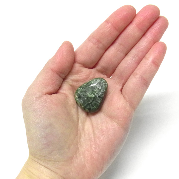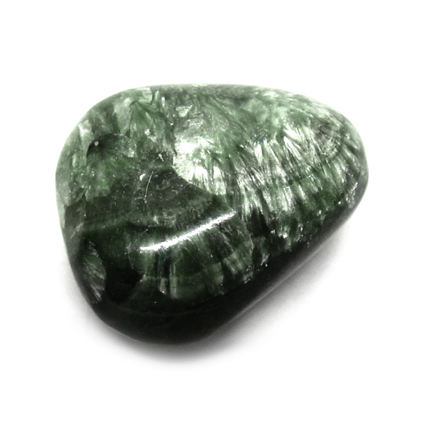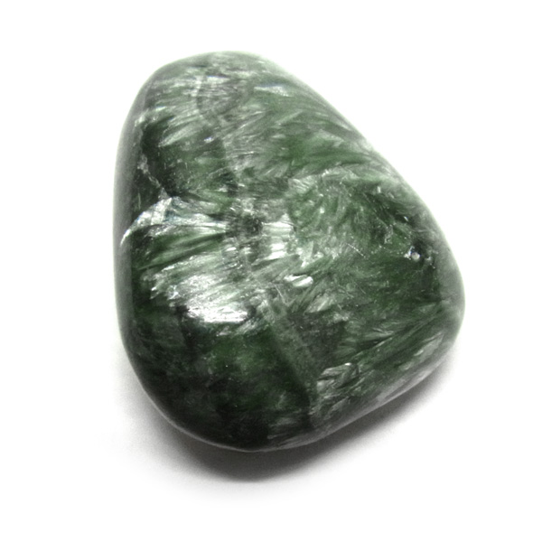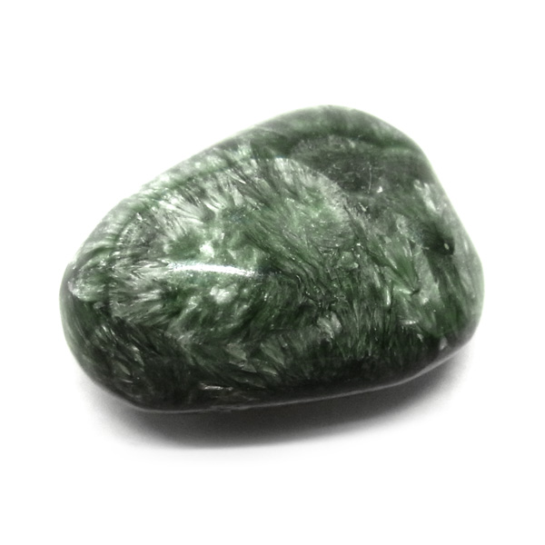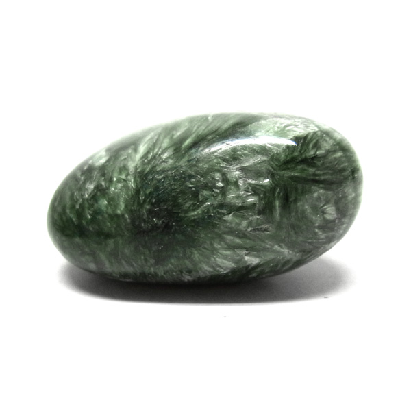美しいグリーンを持つセラフィナイトのタンブルです。色の濃淡が大変美しく、濃いグリーンの部分から白い羽根が舞い落ちるような模様になっています。