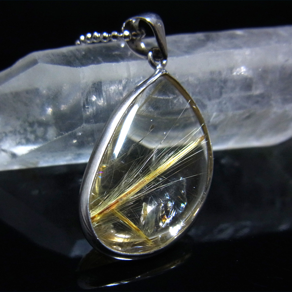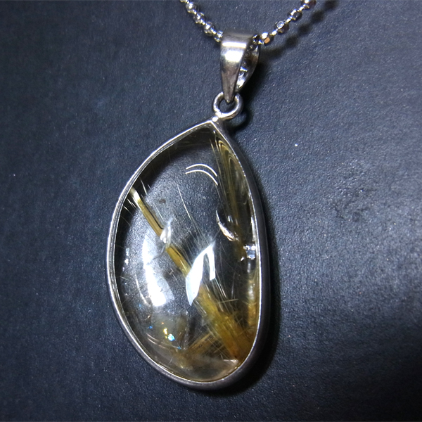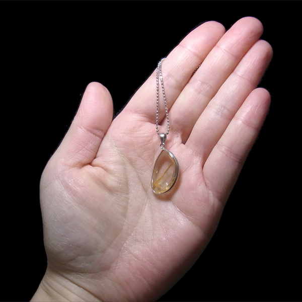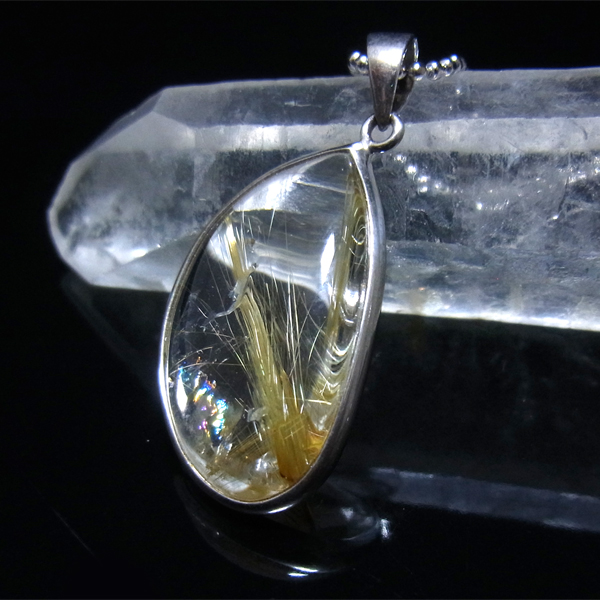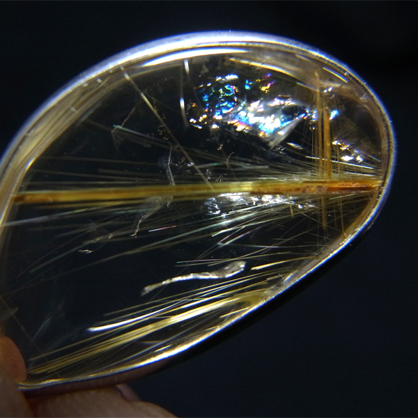 背景がクッキリと見えるほどの透明度の高いクォーツの中に、一筋のルチルが斜めにしっかりと入っているのが魅力的です。 ルーペなどでご覧いただくと、もっと細い針も見られます。 一部レインボーが見えて、大変魅力的です。