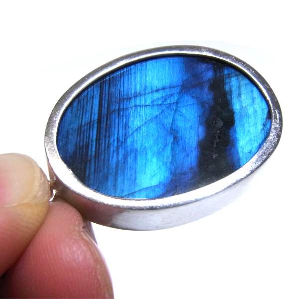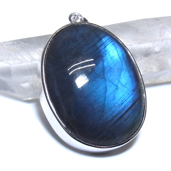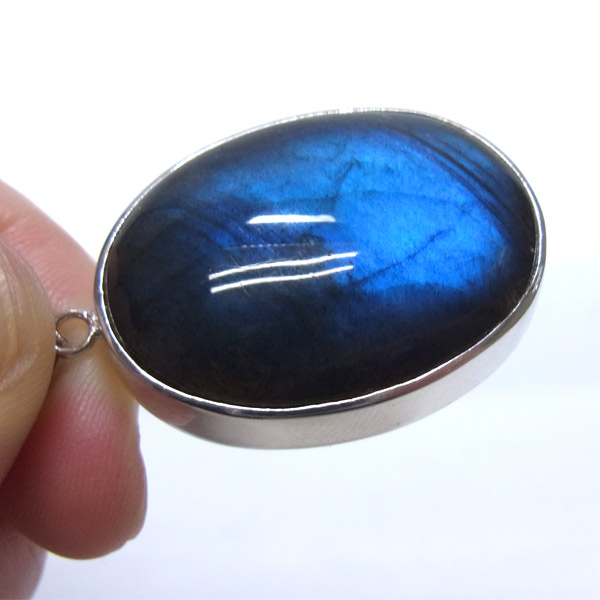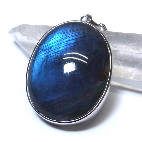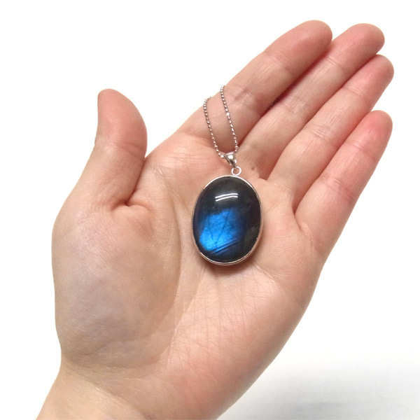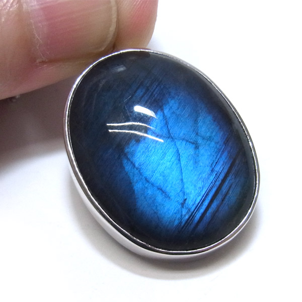 そして、通常のラブラドライトは赤やオレンジなど暖色系のラブラドレッセンスが浮かぶ物が多いのですが、ブラックラブラドライトの場合は、青く美しい光が浮かび上がります。