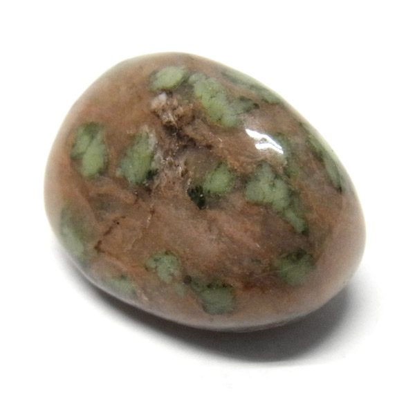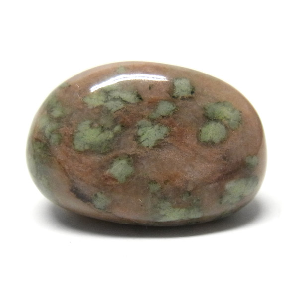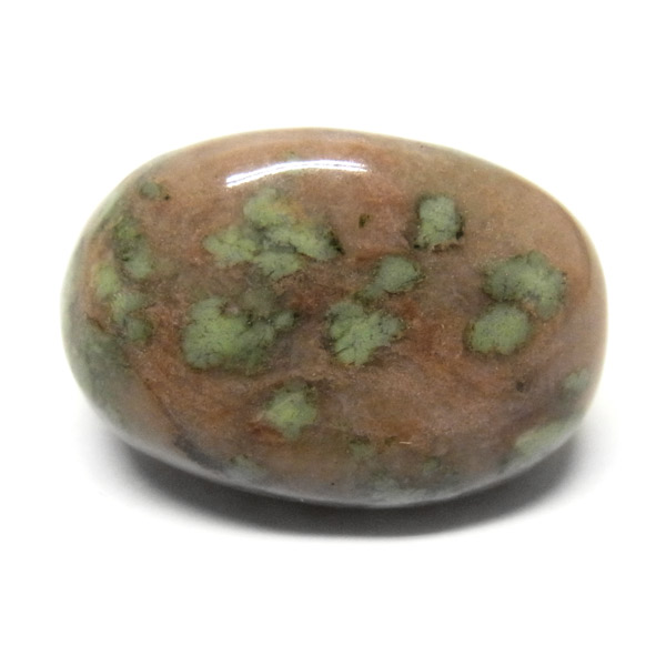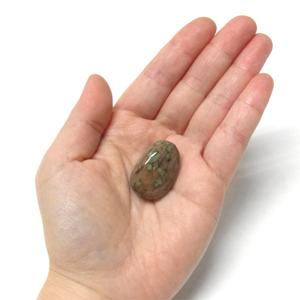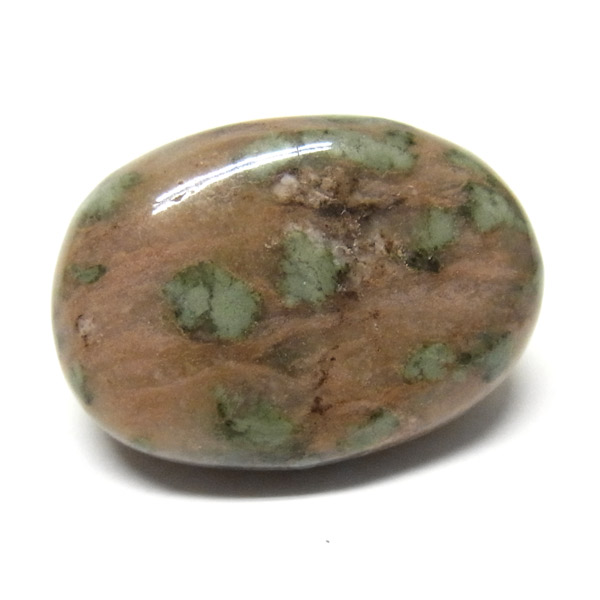 オーストラリア産のナンドライト、タンブルです。ナンドライトはオーストラリア・ニューサウスウェールズ州の小さな町ナンドルが産地である、希少であまり知られていない岩石です。ナンドライトという名前は、この産地に由来しています。ナンドライトの本質的な分類はエジリン閃長岩(エジリン・サイアナイト)にあたります。茶色やベージュ系のサイアナイト母岩の中に、深いグリーンのエジリンがドット状に散りばめられており、その独特な模様と色合いが非常に魅力的です。