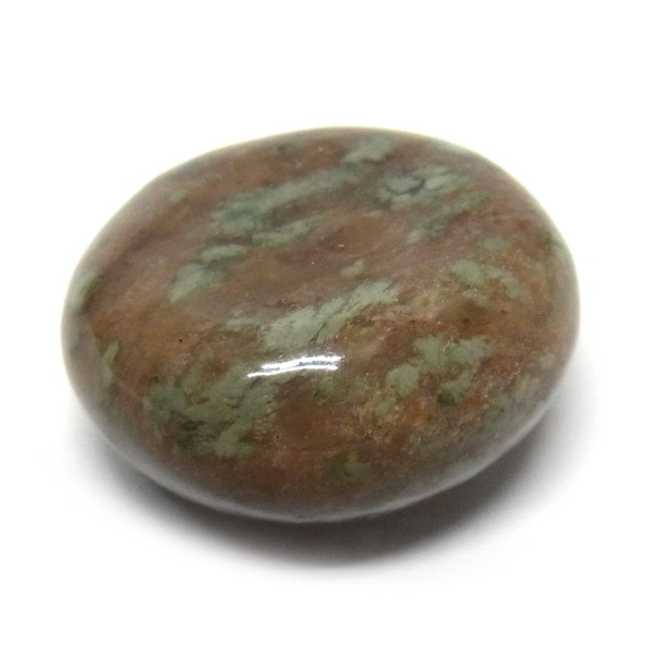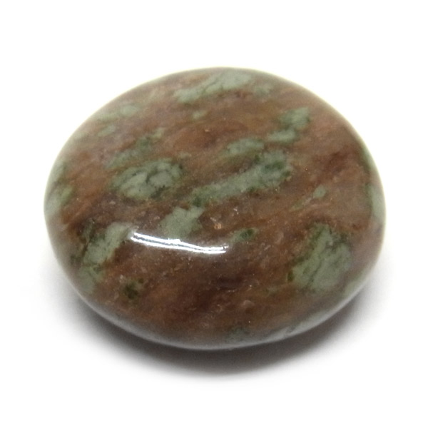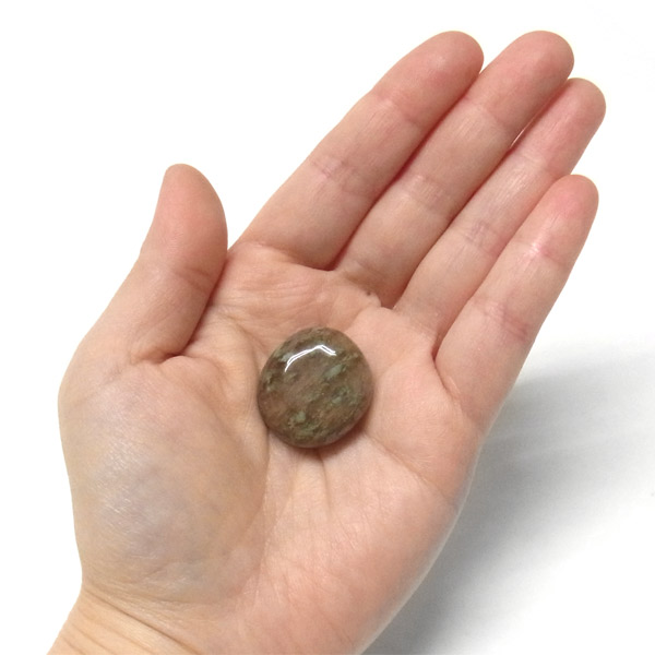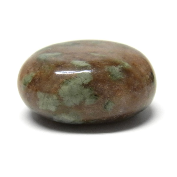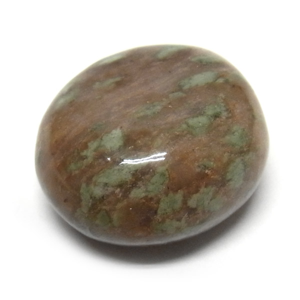 オーストラリア産のナンドライト、タンブルです。ナンドライトはオーストラリア・ニューサウスウェールズ州の小さな町ナンドルが産地である、希少であまり知られていない岩石です。ナンドライトという名前は、この産地に由来しています。ナンドライトの本質的な分類はエジリン閃長岩(エジリン・サイアナイト)にあたります。茶色やベージュ系のサイアナイト母岩の中に、深いグリーンのエジリンがドット状に散りばめられており、その独特な模様と色合いが非常に魅力的です。