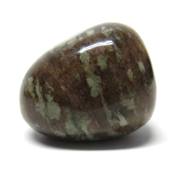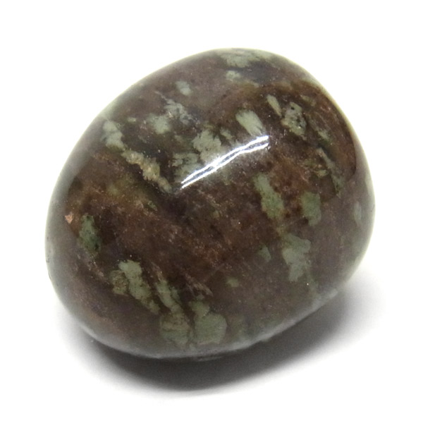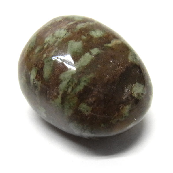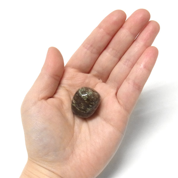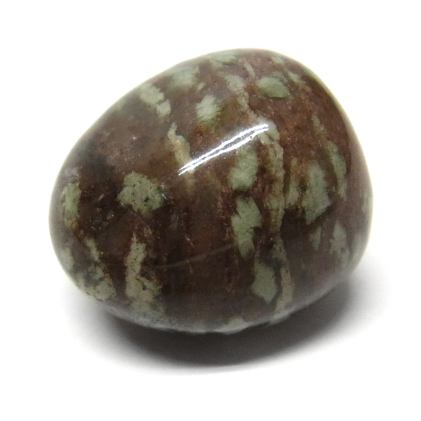 オーストラリア産のナンドライト、タンブルです。ナンドライトはオーストラリア・ニューサウスウェールズ州の小さな町ナンドルが産地である、希少であまり知られていない岩石です。ナンドライトという名前は、この産地に由来しています。ナンドライトの本質的な分類はエジリン閃長岩(エジリン・サイアナイト)にあたります。茶色やベージュ系のサイアナイト母岩の中に、深いグリーンのエジリンがドット状に散りばめられており、その独特な模様と色合いが非常に魅力的です。