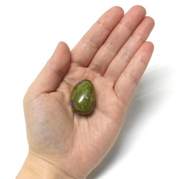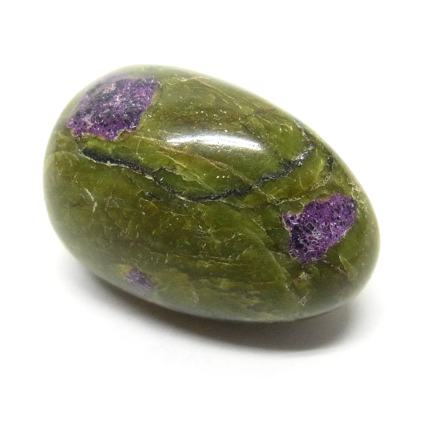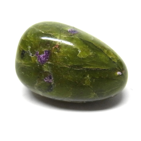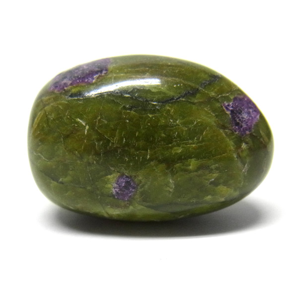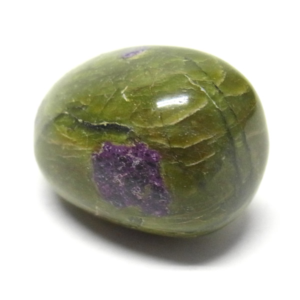 鮮やかな黄緑のサーペンティン(リザーダイド)に、またまた鮮やかな紫色のスティクタイトが点々と彩りを添え、鮮やかな色彩のハーモニーが印象的です。