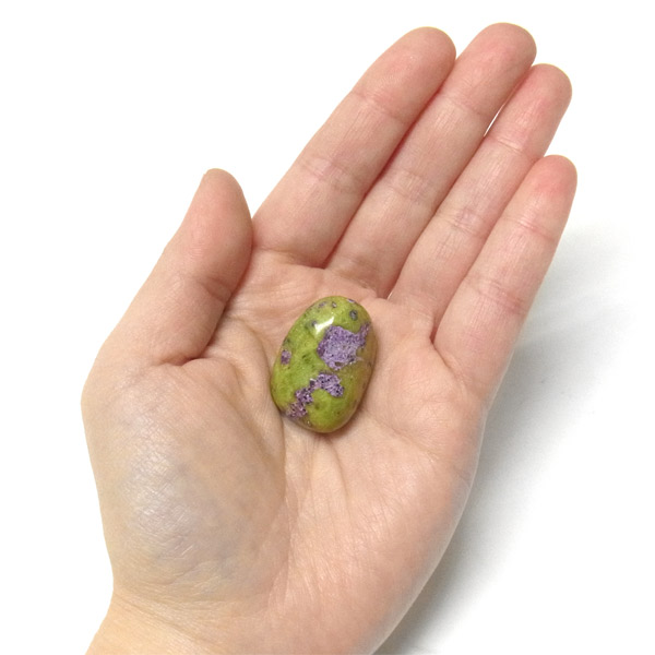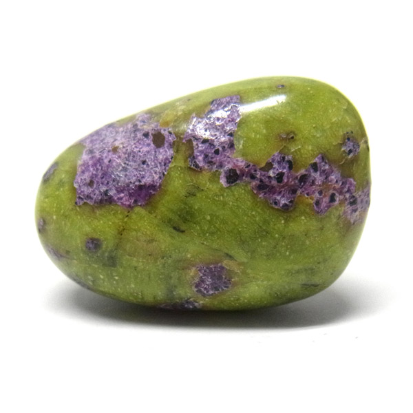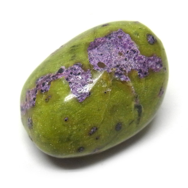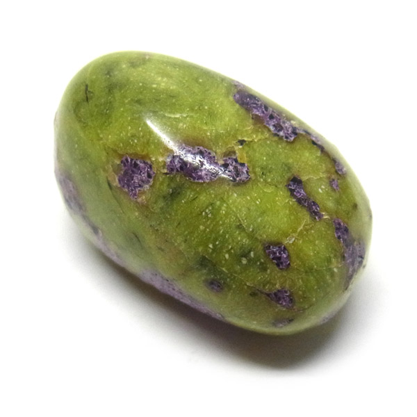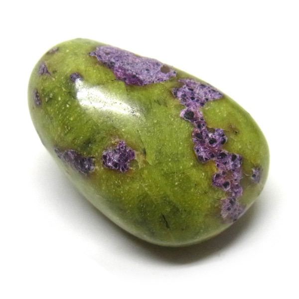 鮮やかな黄緑のサーペンティン(リザーダイド)に、またまた鮮やかな紫色のスティクタイトが点々と彩りを添え、鮮やかな色彩のハーモニーが印象的です。