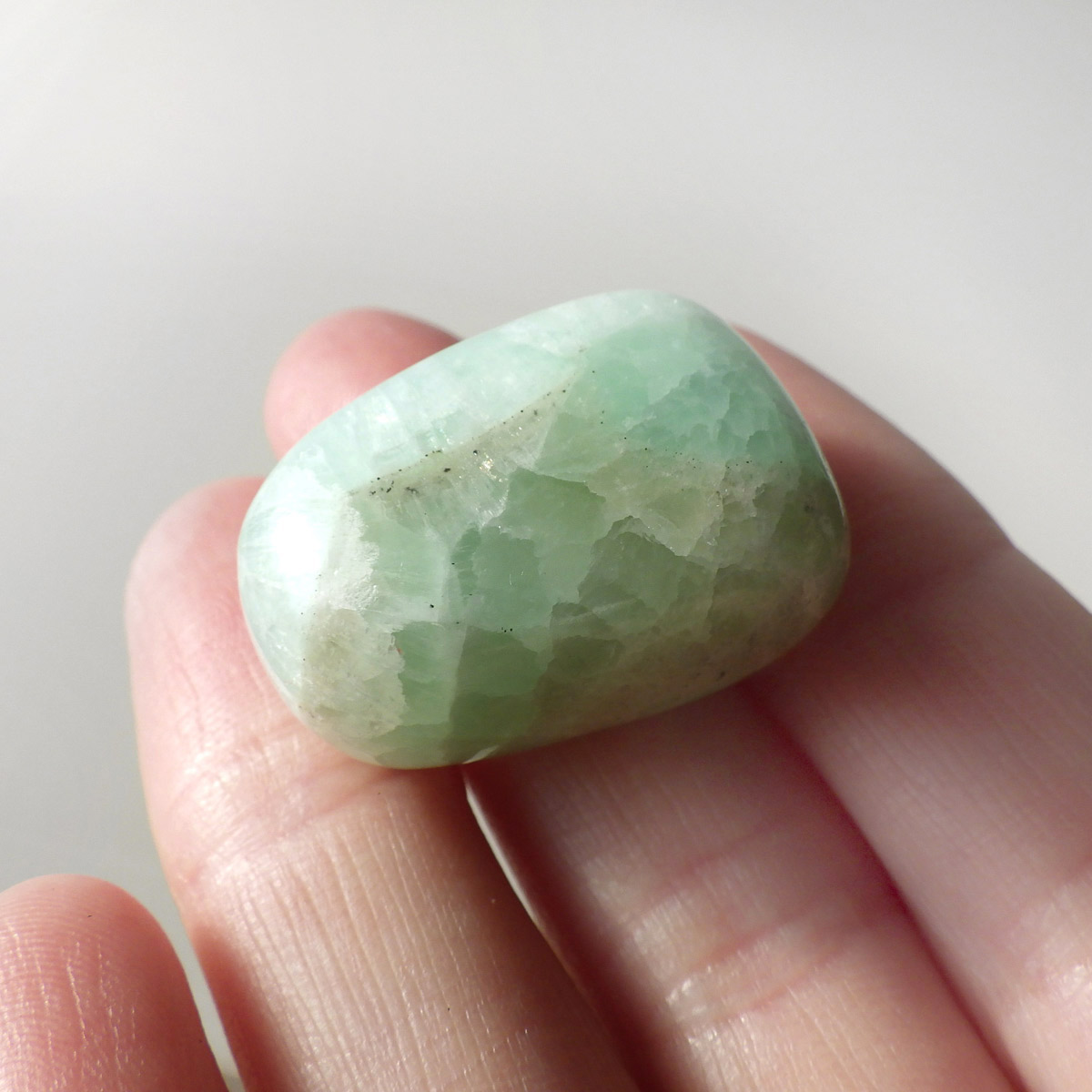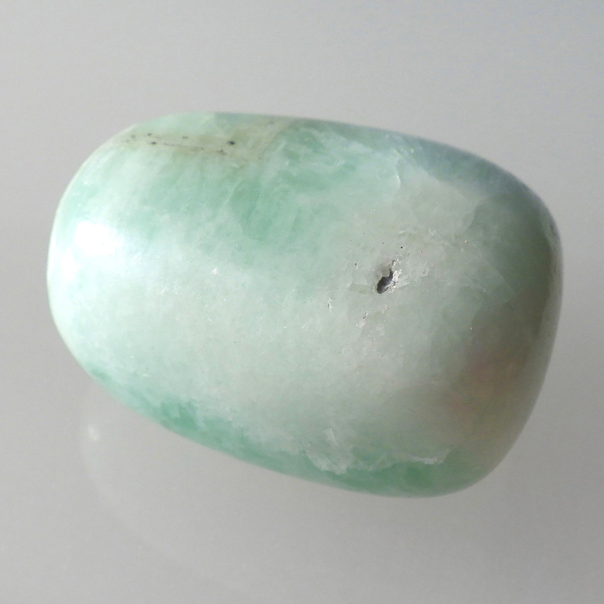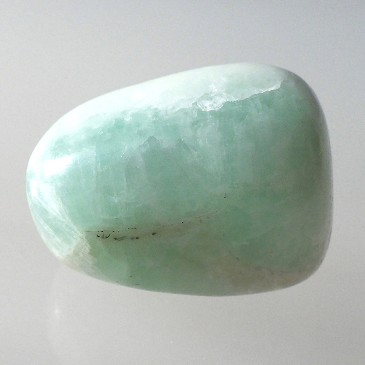アフガニスタン産のピスタチオカルサイト(グリーンカルサイト)タンブルです。アフガニスタンでは、淡いピンクやブルーの多彩なカルサイトが産出します。淡いグリーンのカルサイトは、その色調や濃淡などによって、様々なニックネームがあるようです。同じグリーンカルサイトでも、色が薄く縞目模様が確認出来るものなどは、海に浮かぶ泡に倣って シーフォームカルサイトなどと呼ばれる事もあるようです。このピスタチオカルサイトも、ニックネームで鉱物名ではありませんが、殻を剥いたあとのピスタチオのように、鮮やかでかわいらしいカルサイトです。
