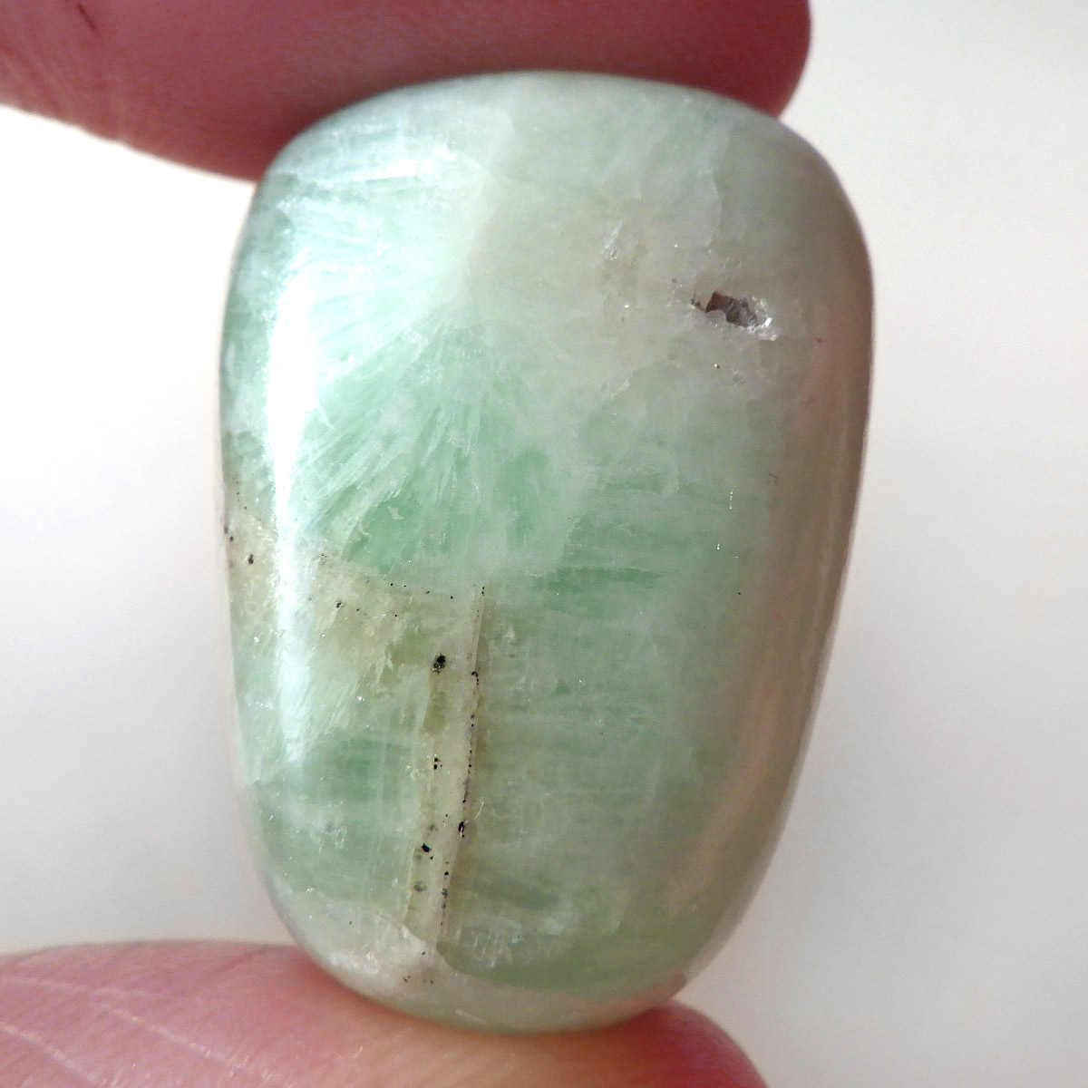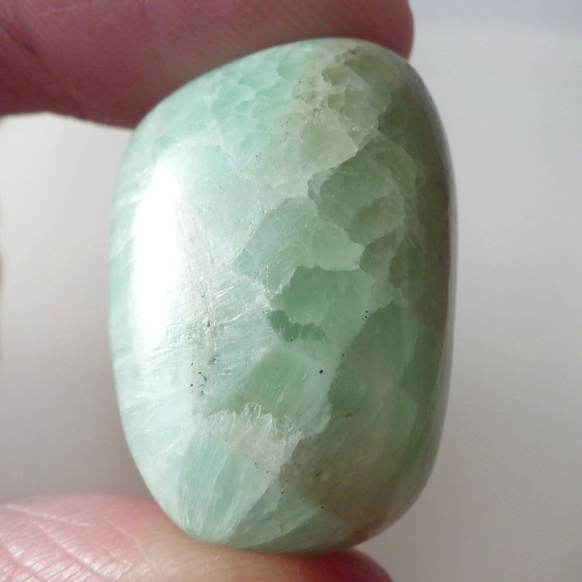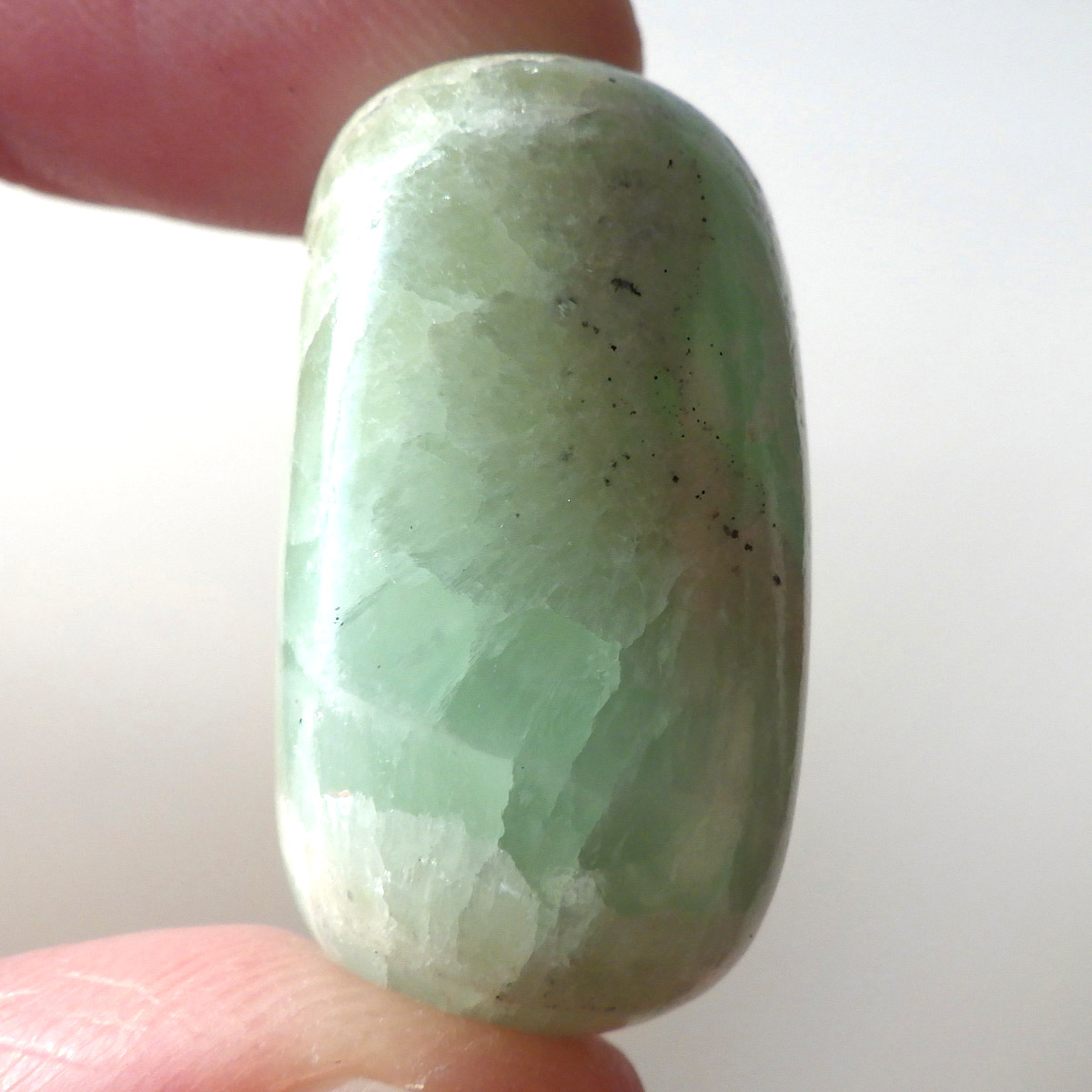 アフガニスタン産のピスタチオカルサイト(グリーンカルサイト)タンブルです。アフガニスタンでは、淡いピンクやブルーの多彩なカルサイトが産出します。淡いグリーンのカルサイトは、その色調や濃淡などによって、様々なニックネームがあるようです。同じグリーンカルサイトでも、色が薄く縞目模様が確認出来るものなどは、海に浮かぶ泡に倣って シーフォームカルサイトなどと呼ばれる事もあるようです。このピスタチオカルサイトも、ニックネームで鉱物名ではありませんが、殻を剥いたあとのピスタチオのように、鮮やかでかわいらしいカルサイトです。