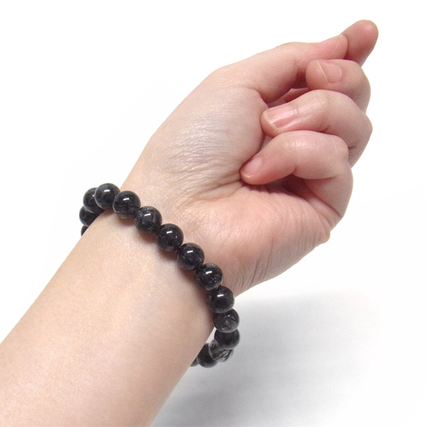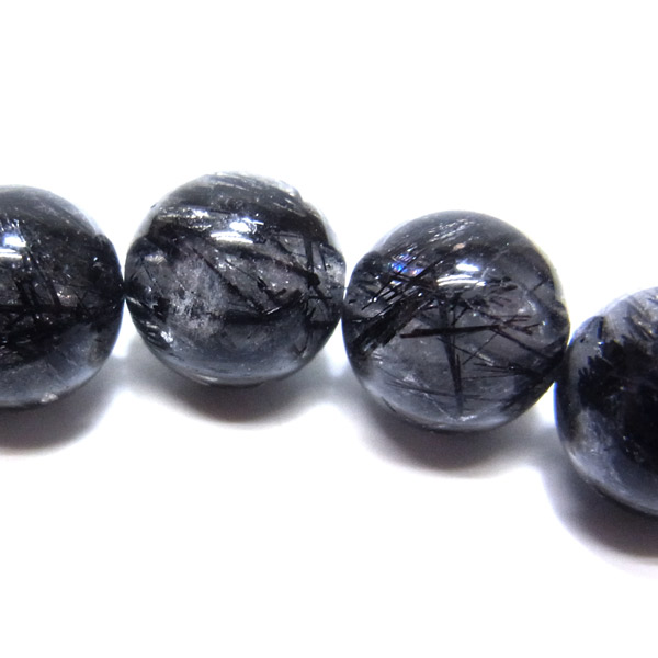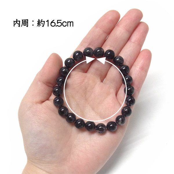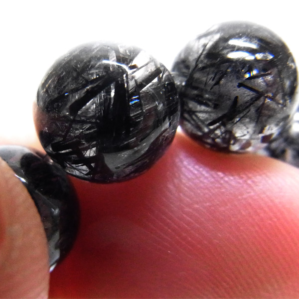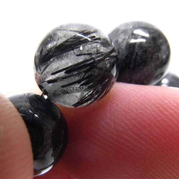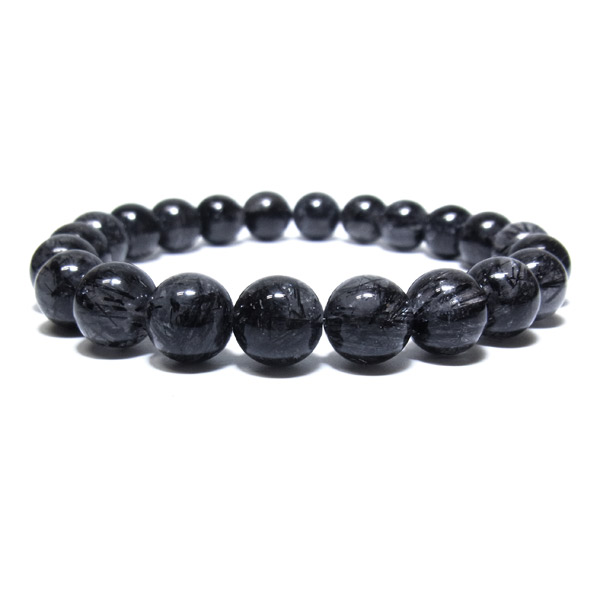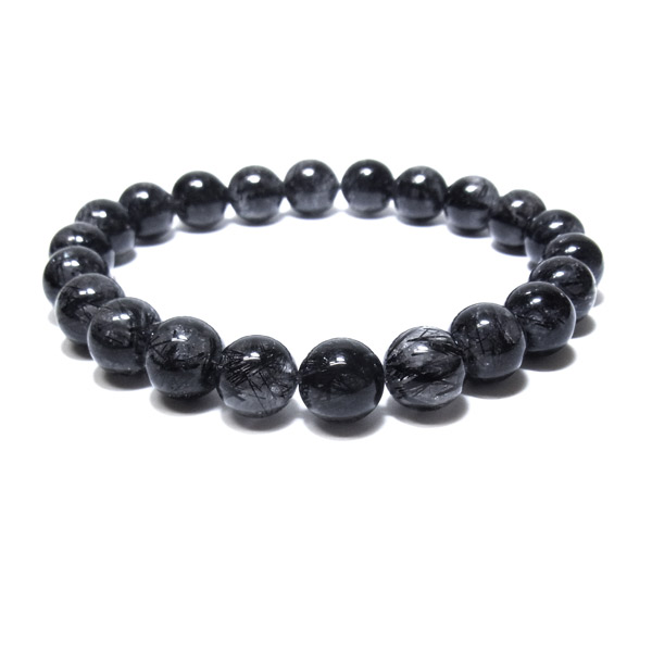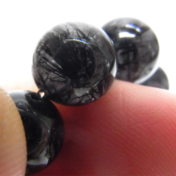 一見、黒いブレスレットに見えますが、実は黒い針が縦横無尽にびっしりとめぐっているため、そう見えるのです。光に透かしたり、ルーペで拡大すると、その針の様子がハッキリと見て取れます。レインボーがキラリと美しい玉もあり、男女問わずお使いいただける商品です。