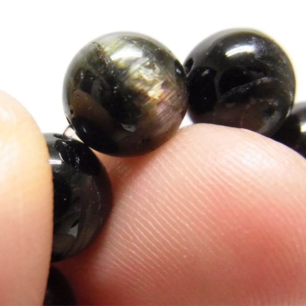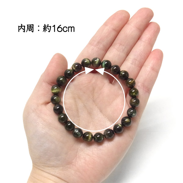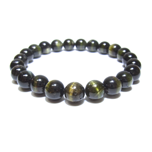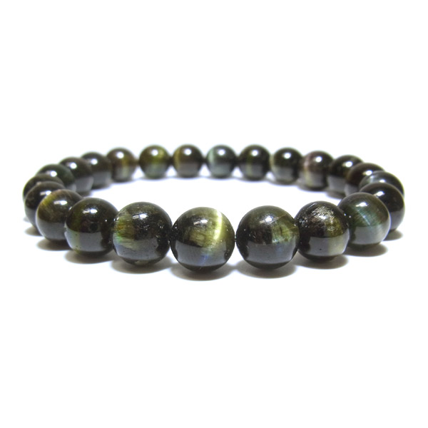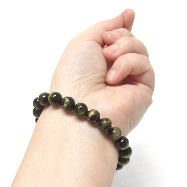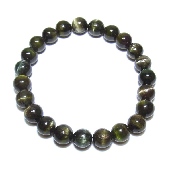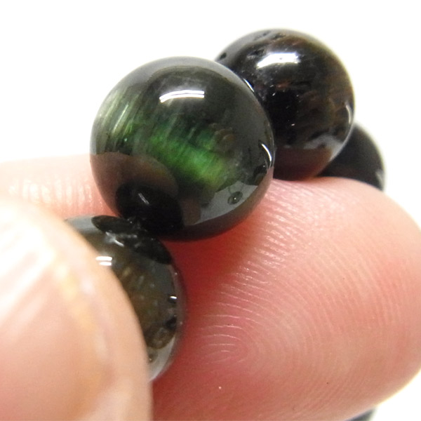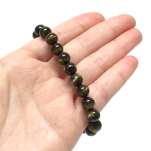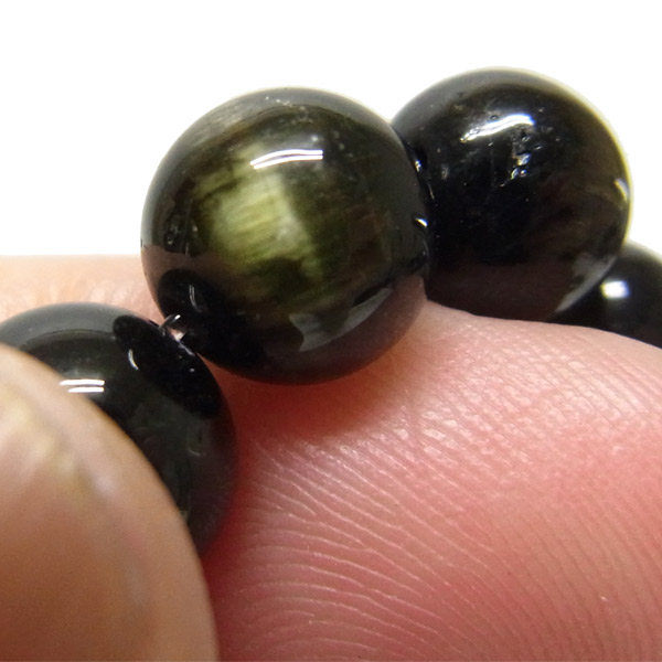 濃いグリーン・イエロー〜ブラックカラーのトルマリンですが、全ての玉にキャッツアイ効果(シャトヤンシー)が確認できる、貴重なブレスレットです。キャッツアイ効果は、猫の目のように明るい光の筋が見える現象のことをいいます。トルマリンキャッツアイの場合は、繊維状の結晶が平行にびっしりとに並ぶことで初めて出現するのです。ペンライトなどでご覧いただくと、よりハッキリとキャッツアイが現れます。また、透明度も高くツヤツヤとした石の表面が魅力的です。