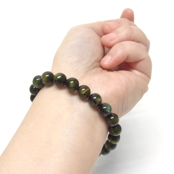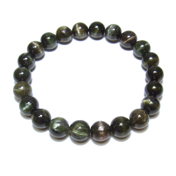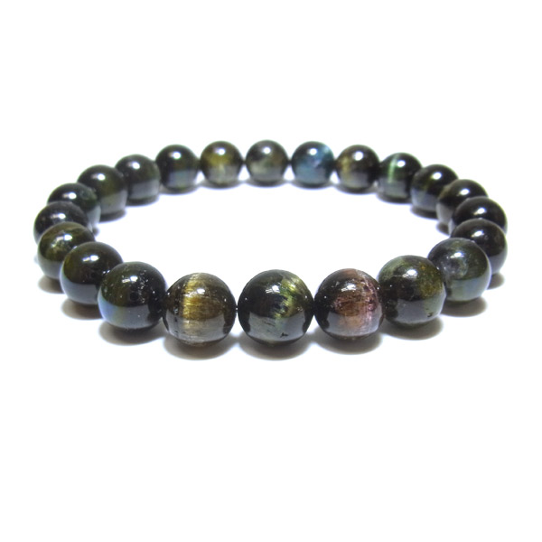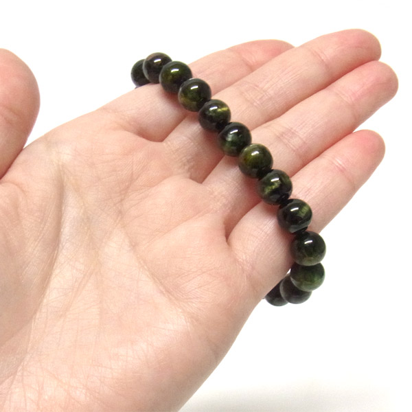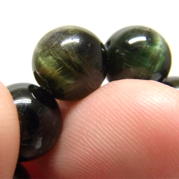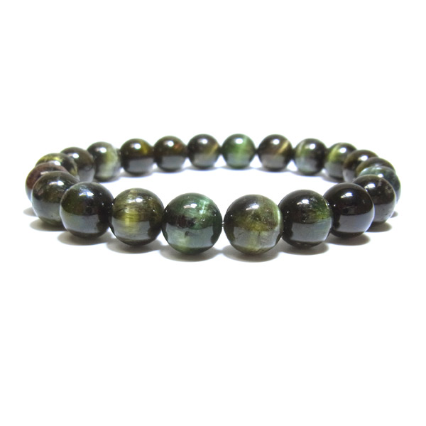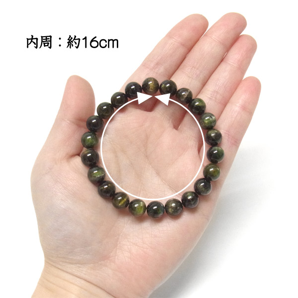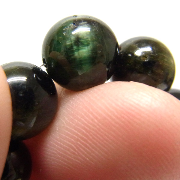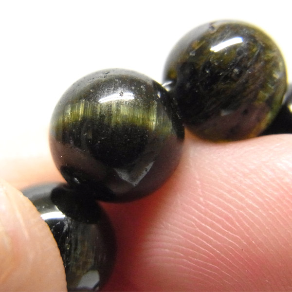 濃いグリーン・イエロー〜ブラックカラーのトルマリンですが、全ての玉にキャッツアイ効果(シャトヤンシー)が確認できる、貴重なブレスレットです。キャッツアイ効果は、猫の目のように明るい光の筋が見える現象のことをいいます。トルマリンキャッツアイの場合は、繊維状の結晶が平行にびっしりとに並ぶことで初めて出現するのです。ペンライトなどでご覧いただくと、よりハッキリとキャッツアイが現れます。