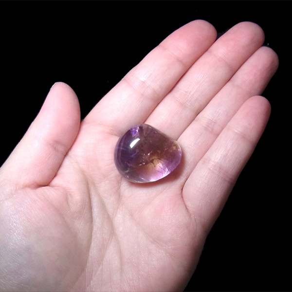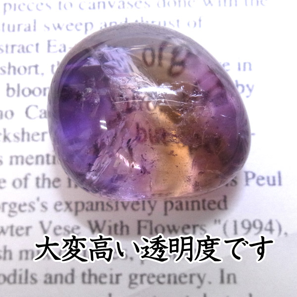また、アメトリンを照らす光の種類や、タンブルの角度によって、濃く見えたり薄く見えたり、青っぽく見えたり赤っぽく見えたり、見ていて飽きることがありません。