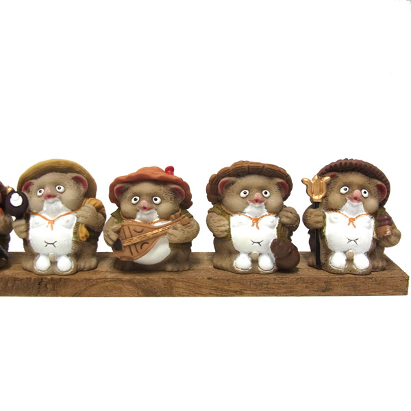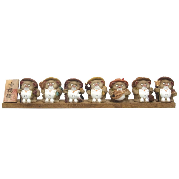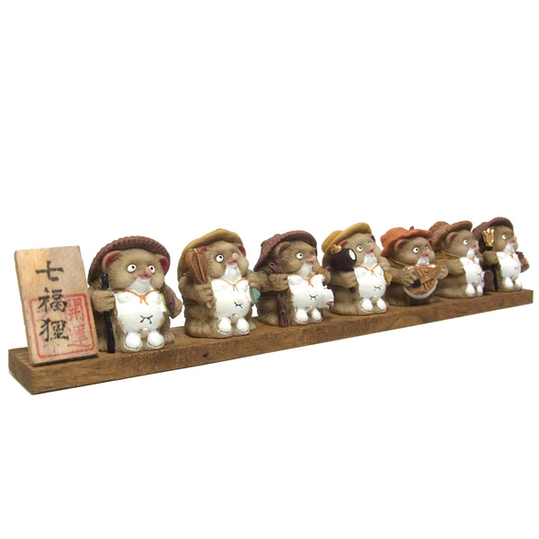 縁起が良く、かわいい七福神の狸の置物です。 たぬきは「他を抜く」とも言われ、商売繁盛の縁起物として知られています。 また狸が被っている笠は災難を避け、普段から身を守る。金袋は金運に恵まれお金に困らないなどのいわれがあります。