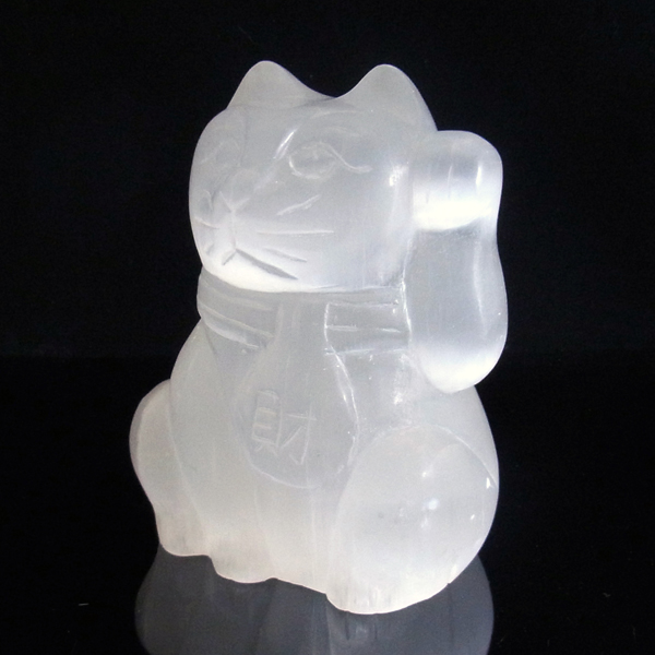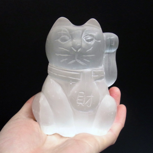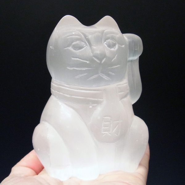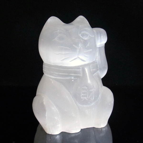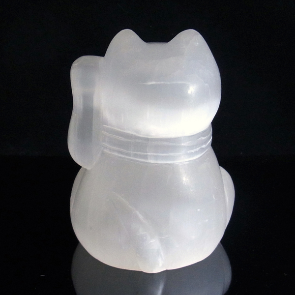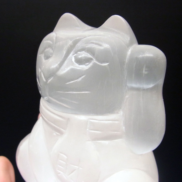 セレナイトから彫りあげられたかわいい天然石の招き猫です。マットな質感のセレナイトが特徴的。縁起物としてはもちろんのこと、セレナイトのシルキーな光沢が幻想的ですので置物としても楽しめます。