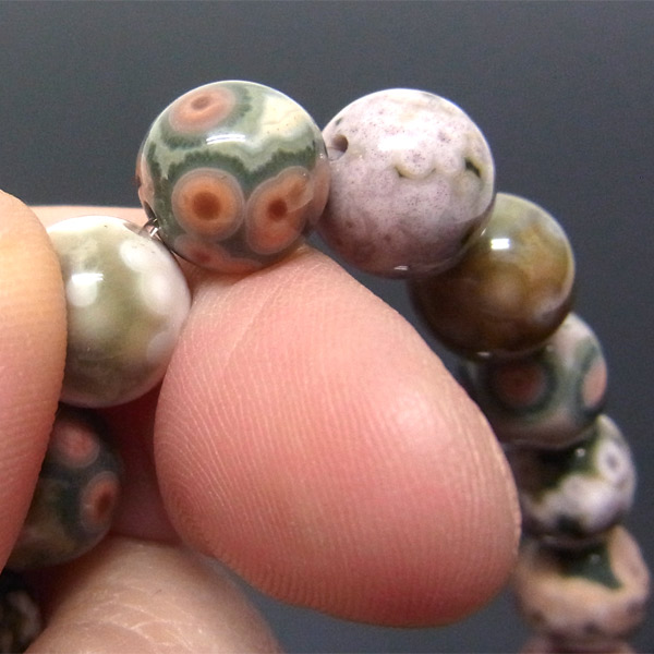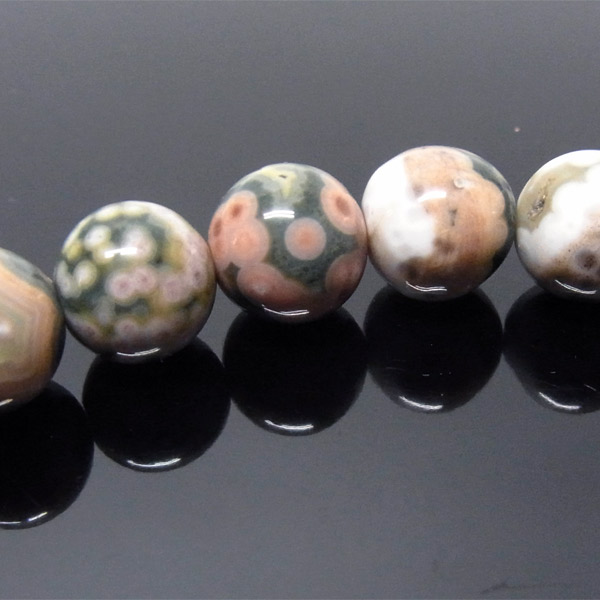オーシャンジャスパーは、ジャスパーの一種でマダガスカルの海岸から産出されるレアストーンです。目玉のような独特の模様が特徴で、これはマグマが火山活動で地上に流れ出し自然に冷え固まる際に、空洞ができその中に石英がしみこむと一緒に流紋岩や、緑泥石などマリモ状の玉が入り込みこの独特の模様ができたと云われています。まさに、自然が作り出すいわば絵画のような芸術品です。海岸の引き潮の時に現れるので、その際にだけ採掘され、足場が砂地なので重機など使えないので手作業にて採掘されます。その為、採掘量が少なく希少な石であり、その独特で多種多彩な姿からとても人気があります。
