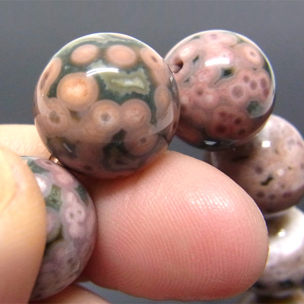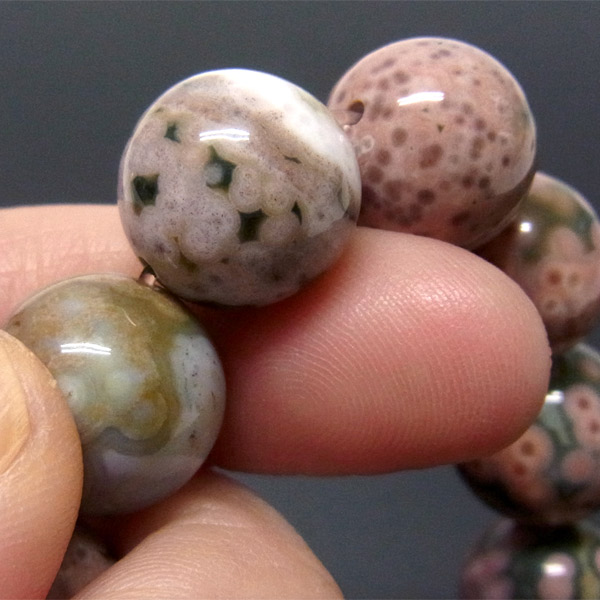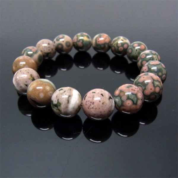 オーシャンジャスパーは、ジャスパーの一種でマダガスカルの海岸から産出されるレアストーンです。目玉のような独特の模様が特徴で、これはマグマが火山活動で地上に流れ出し自然に冷え固まる際に、空洞ができその中に石英がしみこむと一緒に流紋岩や、緑泥石などマリモ状の玉が入り込みこの独特の模様ができたと云われています。まさに、自然が作り出すいわば絵画のような芸術品です。海岸の引き潮の時に現れるので、その際にだけ採掘され、足場が砂地なので重機など使えないので手作業にて採掘されます。その為、採掘量が少なく希少な石であり、その独特で多種多彩な姿からとても人気があります。