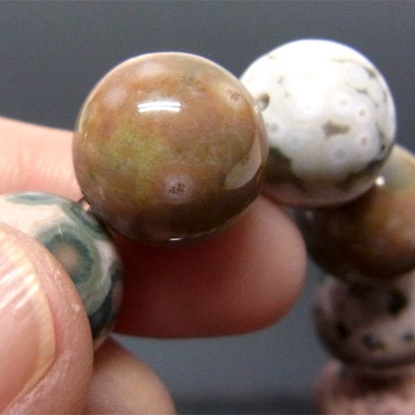オーシャンジャスパーは様々な色合いを持っており、一石の中にベージュ、グリーン、ブラウンなどの色彩と模様が見られます。