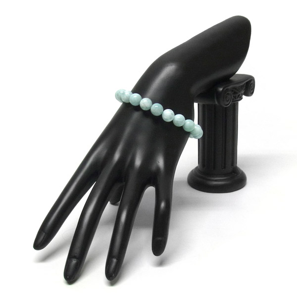 ラリマーを使用したブレスレットです。ラリマーは、ホワイト~淡いブルーの色で構成されており、これによる模様がありますが、このブレスレットは、薄い水色の部分だけを集めた、大変上品な仕上がりになっています。その中でもラリマー特有の白と水色の模様が美しく、不純物もほぼ混ざっていません。 可愛らしさとオシャレ感のあるブレスレットです。