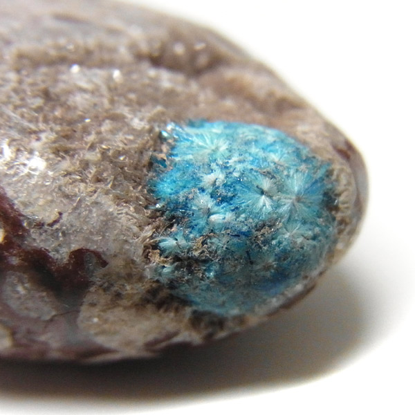 カバンサイトは、沸石の中でも人気を誇る、美しいビビッドな青い発色が魅力です。主成分の、「カルシウム」「バナジウム」「シリコン」の3つの頭文字をつなげて「カバンサイト」と付けられたのが名前の由来です。