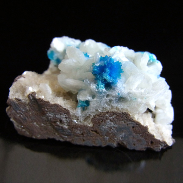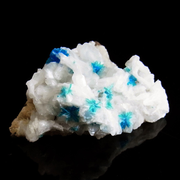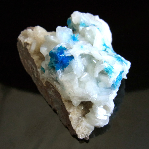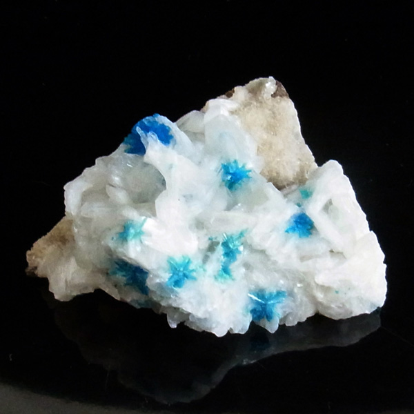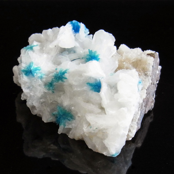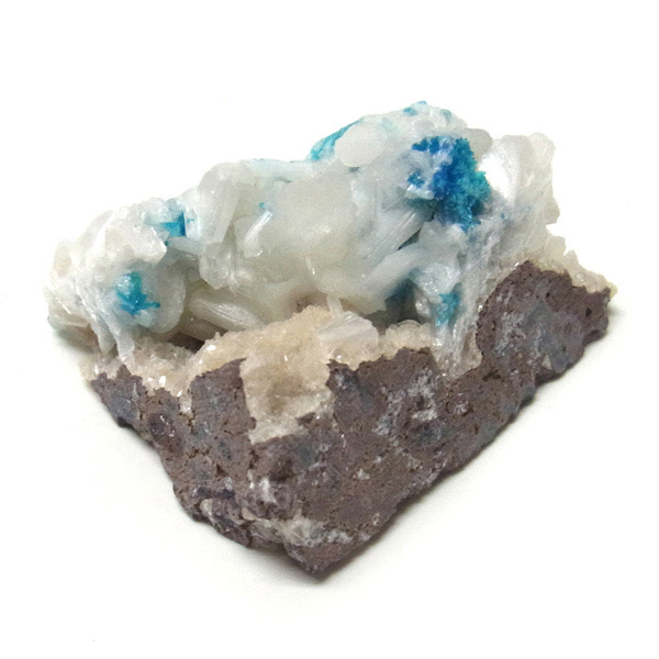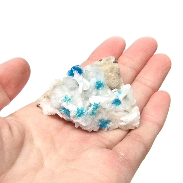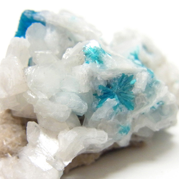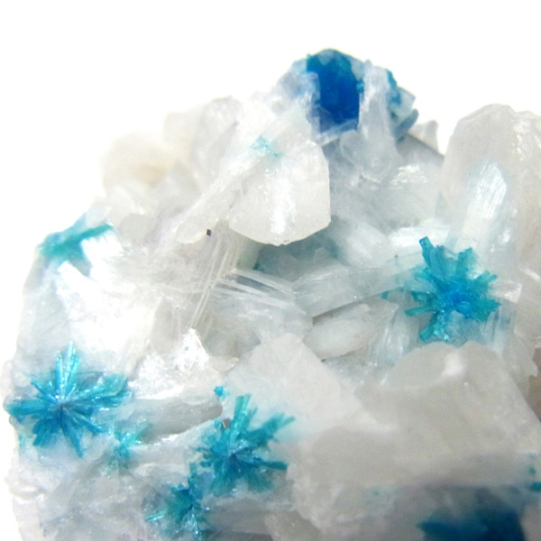 ペンタゴナイトは、カバンサイトと成分は同じで、結晶の仕方が違う鉱物です。カバンサイトは丸っこい結晶ですが、ペンタゴナイトは五稜の星型双晶が形成されるのが特徴です。こちらの原石はきれいな五陵の星形双晶になっており、複数の結晶がまるで星のように散りばめられています。白い部分は沸石でおそらくスティルバイトだと思われます。