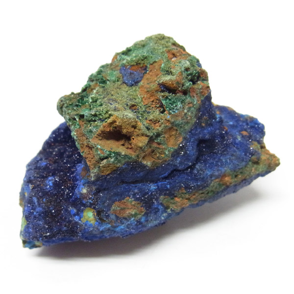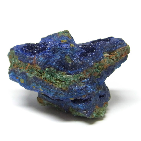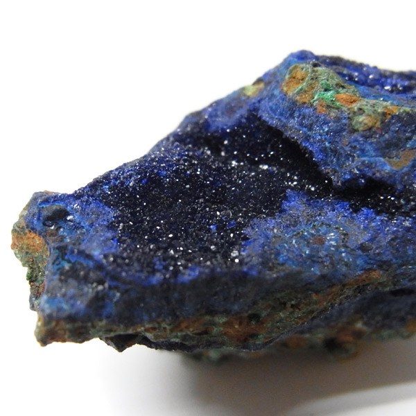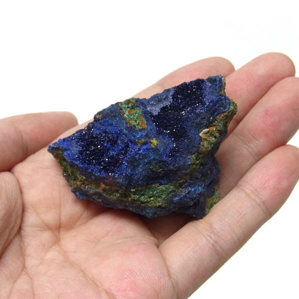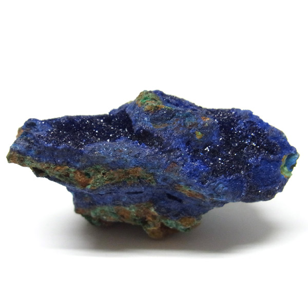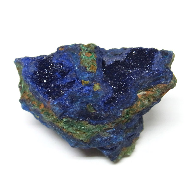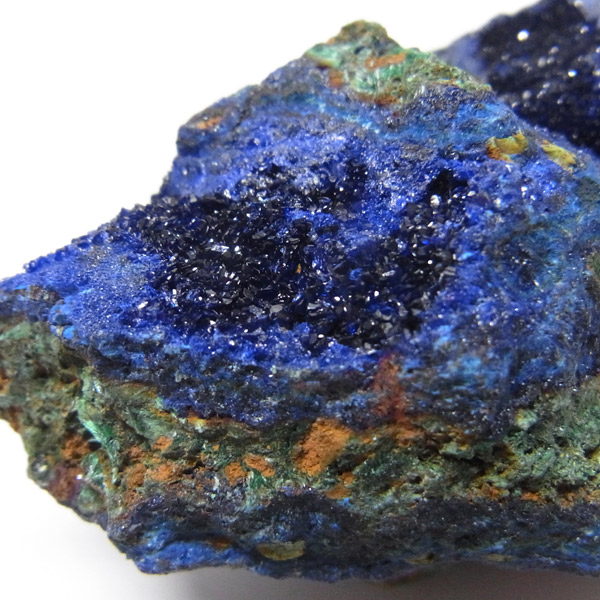 結晶はキラキラ輝き、とてもきれいです。グリーンの部分はアズライトが一部変化したマラカイトです。美しい深いブルーの結晶をみていると吸い込まれそうな感覚さえ感じます。アズライトの濃いブルーとキレイな結晶で、美しさはトップクラスです。