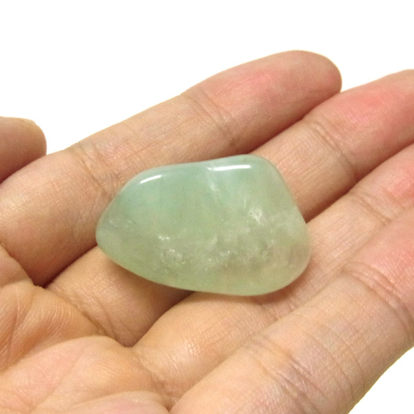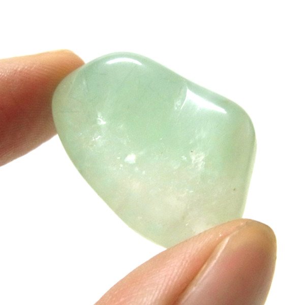 南アフリカ産のプレナイト、タンブルです。プレナイトは、淡い青緑から黄色にかけての色合いの石。1788年に南アフリカで初めてこの石を発見したフォン・プレーン大佐にちなんで名付けられました。葡萄石という和名は産出時に見た目が葡萄のようであったことから名づけられました。今回は黄色味がかったものではなく、発色の良いミルキーな青よりの緑のプレナイトをご用意いたしました。優しい色合いで心が落ち着きます。