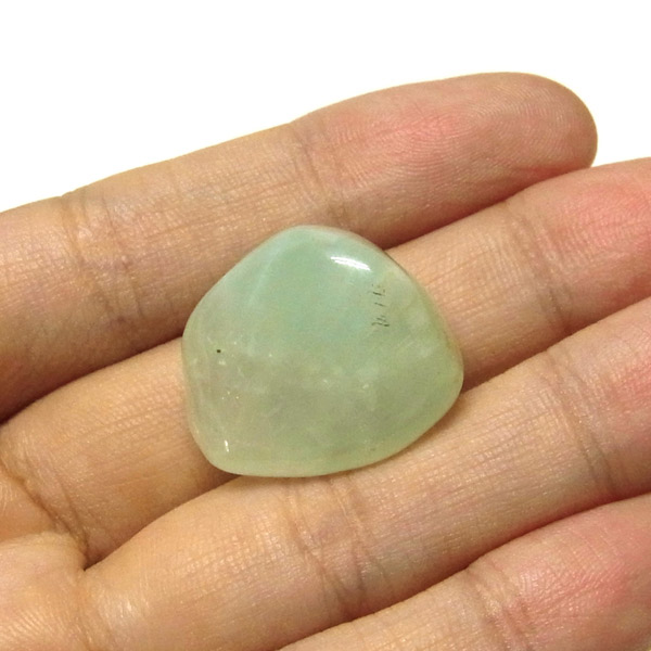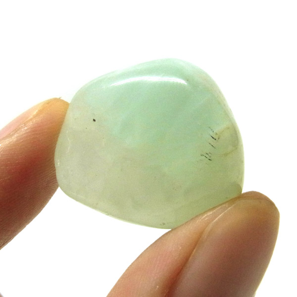 南アフリカ産のプレナイト、タンブルです。プレナイトは、淡い青緑から黄色にかけての色合いの石。1788年に南アフリカで初めてこの石を発見したフォン・プレーン大佐にちなんで名付けられました。葡萄石という和名は産出時に見た目が葡萄のようであったことから名づけられました。今回は黄色味がかったものではなく、発色の良いミルキーな青よりの緑のプレナイトをご用意いたしました。優しい色合いで心が落ち着きます。