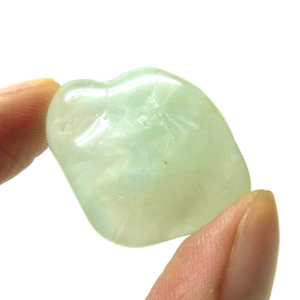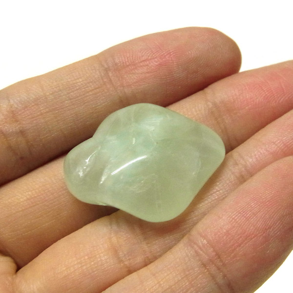 南アフリカ産のプレナイト、タンブルです。プレナイトは、淡い青緑から黄色にかけての色合いの石。1788年に南アフリカで初めてこの石を発見したフォン・プレーン大佐にちなんで名付けられました。葡萄石という和名は産出時に見た目が葡萄のようであったことから名づけられました。今回は黄色味がかったものではなく、発色の良いミルキーな青よりの緑のプレナイトをご用意いたしました。優しい色合いで心が落ち着きます。