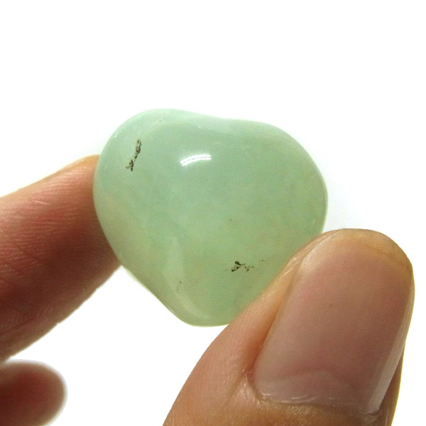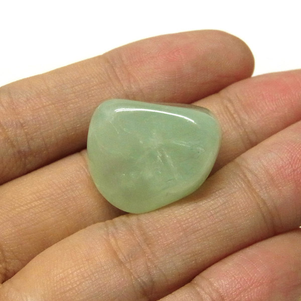 南アフリカ産のプレナイト、タンブルです。プレナイトは、淡い青緑から黄色にかけての色合いの石。1788年に南アフリカで初めてこの石を発見したフォン・プレーン大佐にちなんで名付けられました。葡萄石という和名は産出時に見た目が葡萄のようであったことから名づけられました。今回は黄色味がかったものではなく、発色の良いミルキーな青よりの緑のプレナイトをご用意いたしました。優しい色合いで心が落ち着きます。