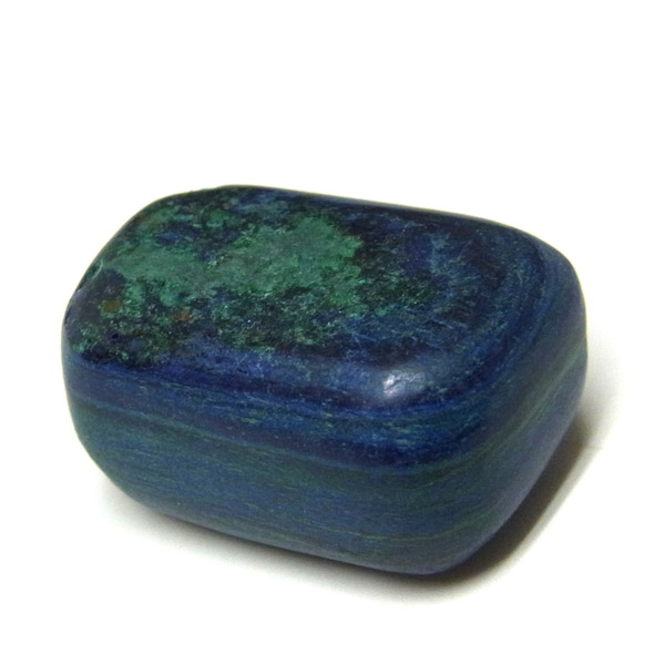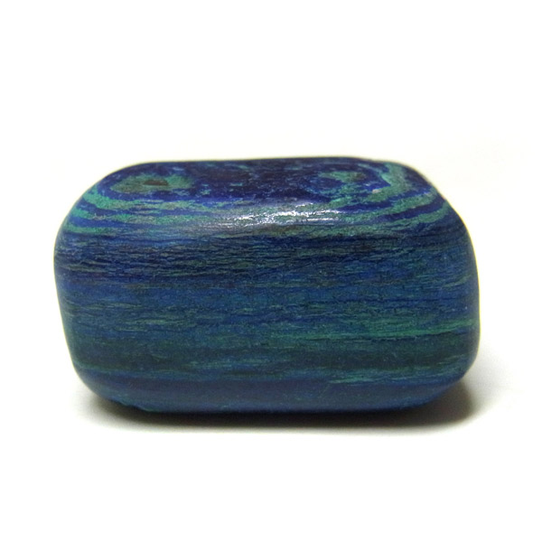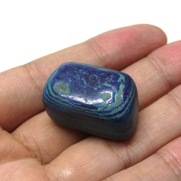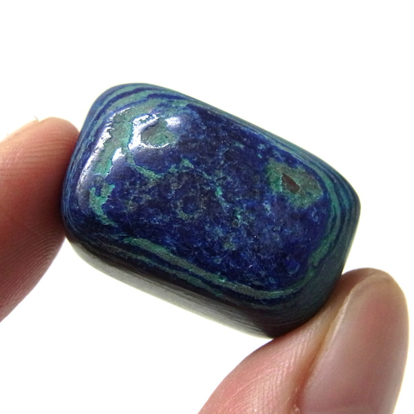 モロッコ産のアズライト、タンブルです。モロッコ産のアズライトは高品質なものが多く、混じりっ気のない綺麗なアズライトが産出されます。アズライト自体は産出量が少ない為、希少価値が高い石です。濃いアズライトブルーにマラカイトグリーンがアクセントで美しさはトップクラスです。