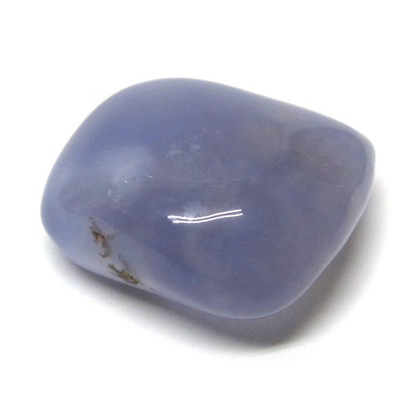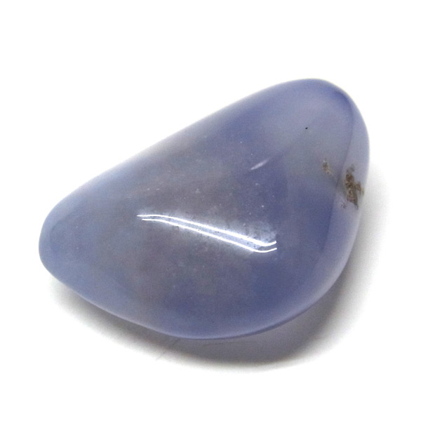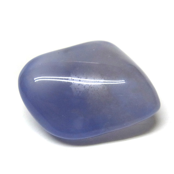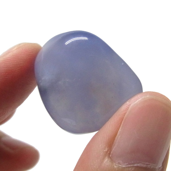 南アフリカ産のブルーカルセドニー、タンブルです。カルセドニーはアゲートとよく似ており、いろいろな色が混ざっており、模様があるものがアゲート、色が均一で模様がないものがカルセドニー分類されています。カルセドニーのグループにはカーネリアンやクリソプレーズなど鮮やかな石があるのは有名です。こちらのブルーカルセドニーは落ち着いたブルーの天然の発色で、光に当てるとミルキーな透け感があります。発色が良く、高品質なブルーカルセドニーのタンブルです。