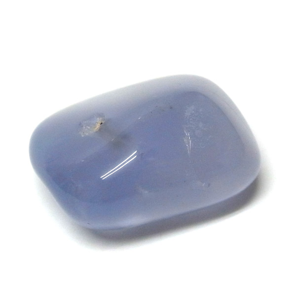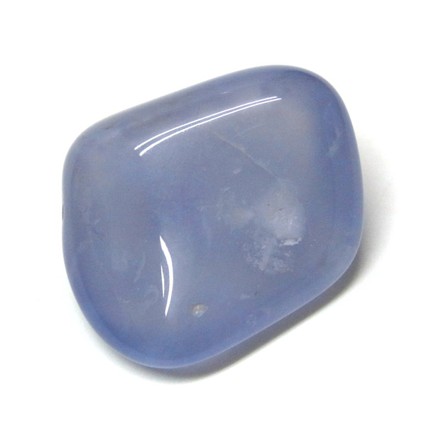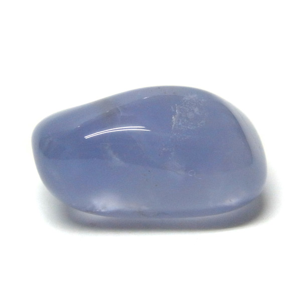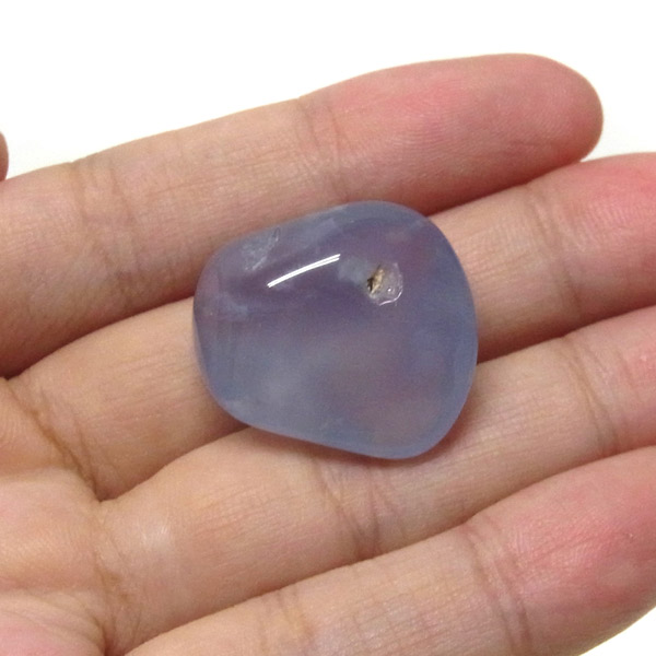 南アフリカ産のブルーカルセドニー、タンブルです。カルセドニーはアゲートとよく似ており、いろいろな色が混ざっており、模様があるものがアゲート、色が均一で模様がないものがカルセドニー分類されています。カルセドニーのグループにはカーネリアンやクリソプレーズなど鮮やかな石があるのは有名です。こちらのブルーカルセドニーは落ち着いたブルーの天然の発色で、光に当てるとミルキーな透け感があります。発色が良く、高品質なブルーカルセドニーのタンブルです。