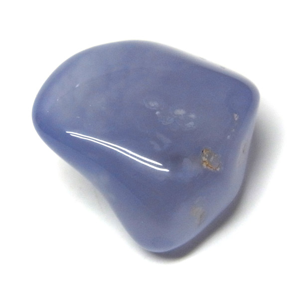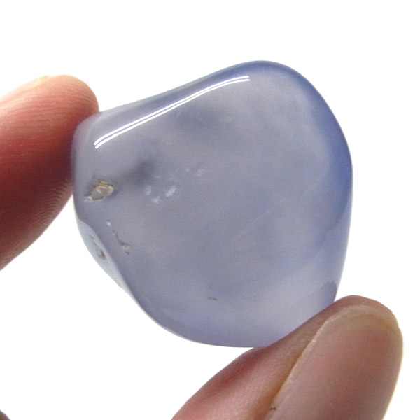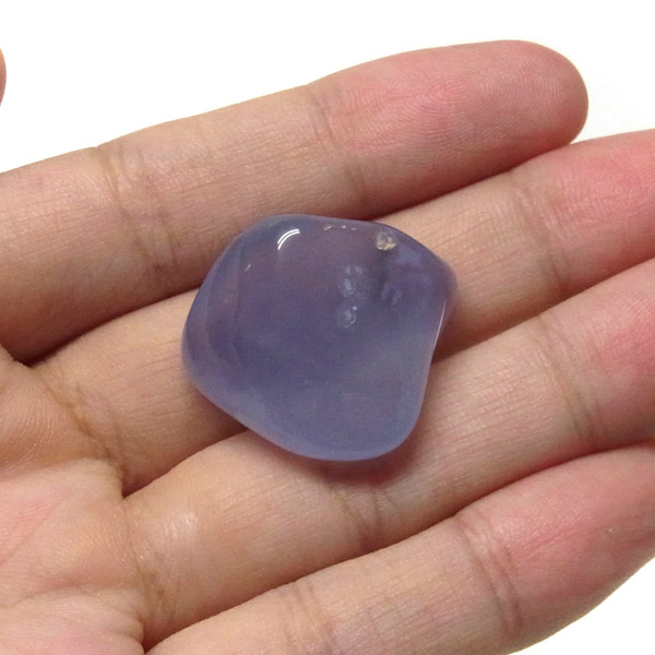 南アフリカ産のブルーカルセドニー、タンブルです。カルセドニーはアゲートとよく似ており、いろいろな色が混ざっており、模様があるものがアゲート、色が均一で模様がないものがカルセドニー分類されています。カルセドニーのグループにはカーネリアンやクリソプレーズなど鮮やかな石があるのは有名です。こちらのブルーカルセドニーは落ち着いたブルーの天然の発色で、光に当てるとミルキーな透け感があります。発色が良く、高品質なブルーカルセドニーのタンブルです。
