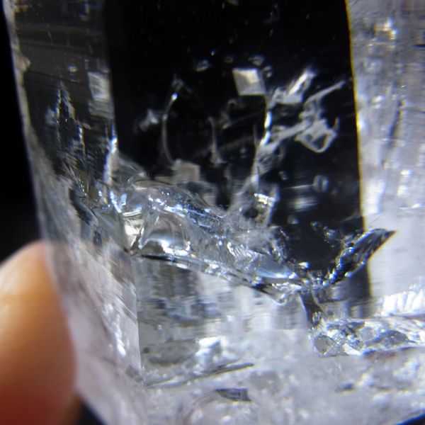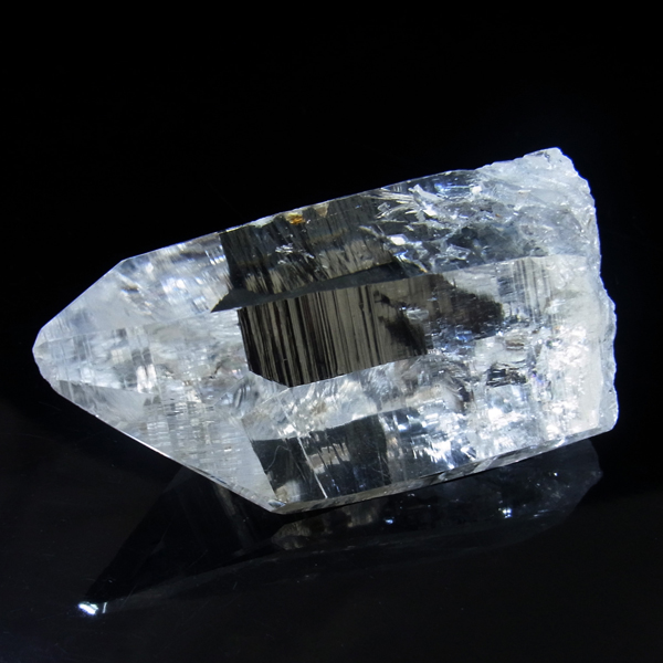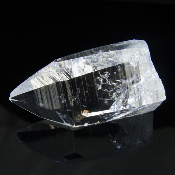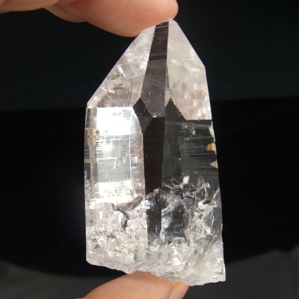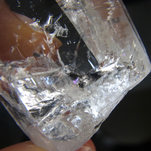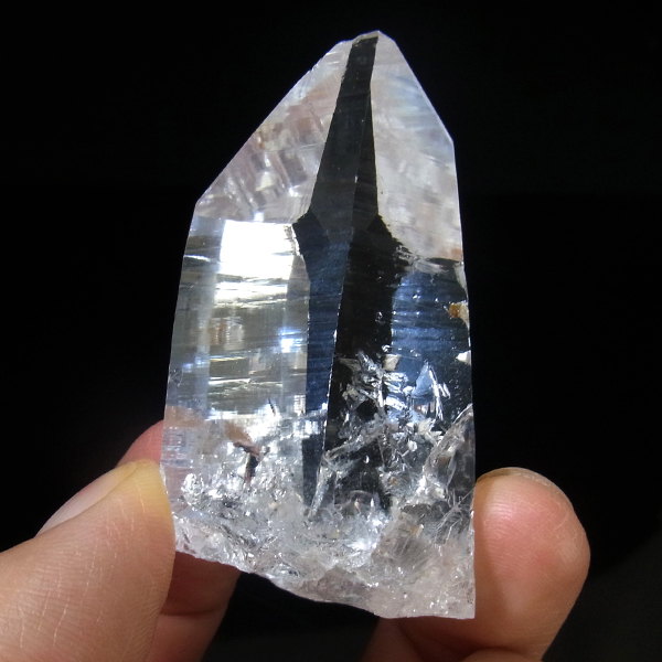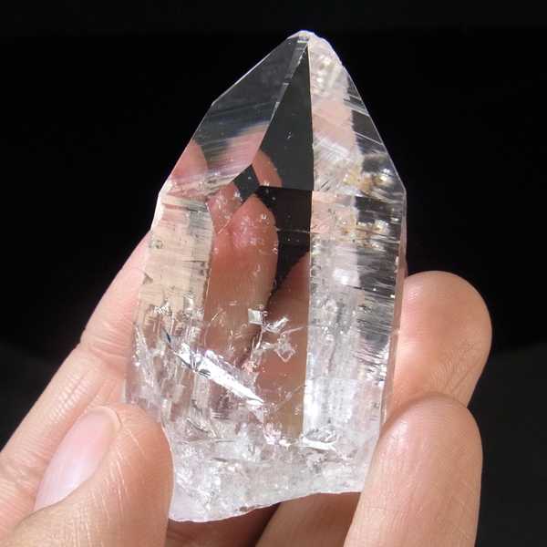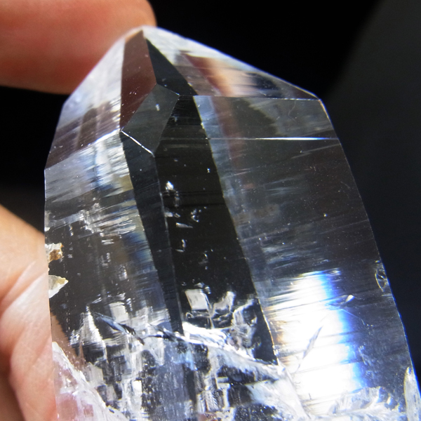 コロンビア産のコロンビアレムリアンポイントです。コロンビア産の水晶は世界屈指の圧倒的な透明度と、光を跳ね返す表面のテリが特徴的です。レムリアンのバーコードが入っていながらも、クッキリと背景が透けて見えます。虹のレインボー、タイムリンクといわれる平行四辺形の面も確認できます。