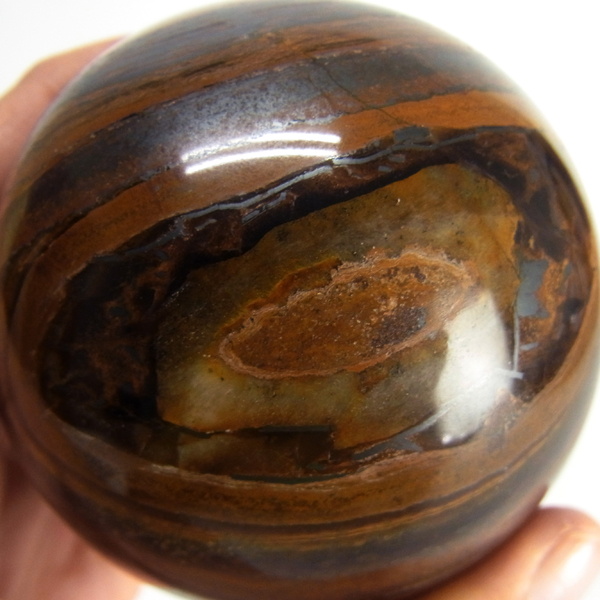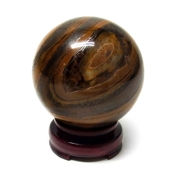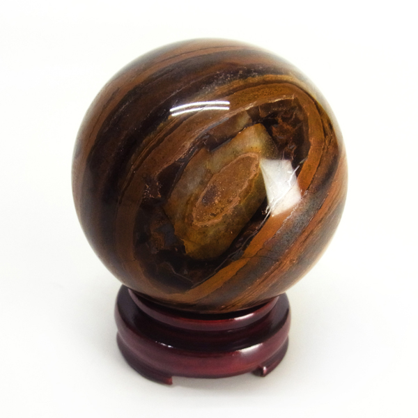 南アフリカ産のアイアンタイガーアイ球です。 アイアンタイガーアイは、タイガーアイに鉄分が多く含まれ、タイガーアイ、ジャスパー、ヘマタイトなどが層になっている丸玉です。 主にタイガーアイ層から成り、ヘマタイトのメタリックがきれいにでています。