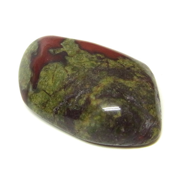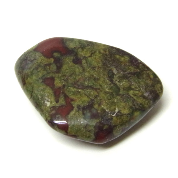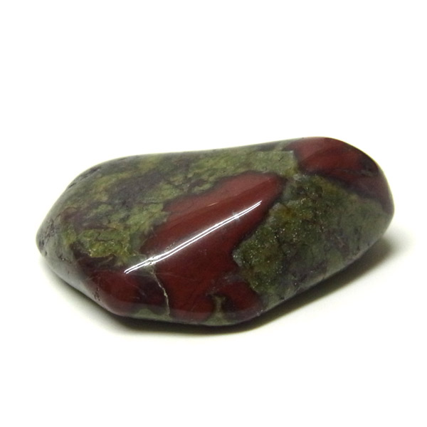 南アフリカ産のドラゴンストーン、タンブルです。現在では南アフリカまたはオーストラリアで産出される石のようです。ドラゴンストーンまたはドラゴンブラッドジャスパーと呼ばれます。これは、ドラゴンの皮膚を思わせる緑色に、ドラゴンの血をイメージさせる赤い点や筋が入っていることから名付けられています。日本ではあまり文献がないのですが基本はジャスパーだと思われます。こちらは磨いたタンブルですが、原石の状態ですとドラゴン模様の緑の石に本当にドラゴンの血が付いたのではと思わせられます。見た目は綺麗というよりは力強くかっこいい石です。