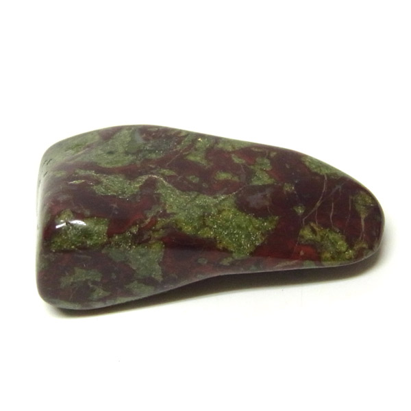 南アフリカ産のドラゴンストーン、タンブルです。現在では南アフリカまたはオーストラリアで産出される石のようです。ドラゴンストーンまたはドラゴンブラッドジャスパーと呼ばれます。これは、ドラゴンの皮膚を思わせる緑色に、ドラゴンの血をイメージさせる赤い点や筋が入っていることから名付けられています。日本ではあまり文献がないのですが基本はジャスパーだと思われます。こちらは磨いたタンブルですが、原石の状態ですとドラゴン模様の緑の石に本当にドラゴンの血が付いたのではと思わせられます。見た目は綺麗というよりは力強くかっこいい石です。
