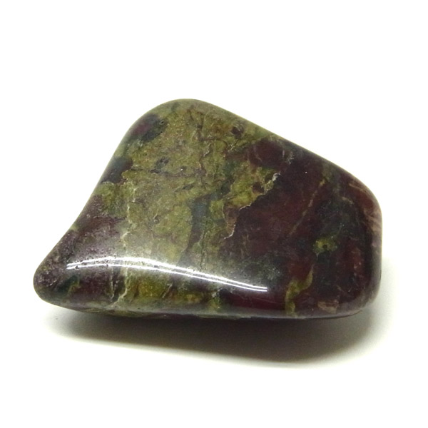 南アフリカ産のドラゴンストーン、タンブルです。現在では南アフリカまたはオーストラリアで産出される石のようです。ドラゴンストーンまたはドラゴンブラッドジャスパーと呼ばれます。これは、ドラゴンの皮膚を思わせる緑色に、ドラゴンの血をイメージさせる赤い点や筋が入っていることから名付けられています。日本ではあまり文献がないのですが基本はジャスパーだと思われます。こちらは磨いたタンブルですが、原石の状態ですとドラゴン模様の緑の石に本当にドラゴンの血が付いたのではと思わせられます。見た目は綺麗というよりは力強くかっこいい石です。