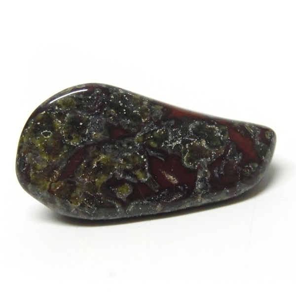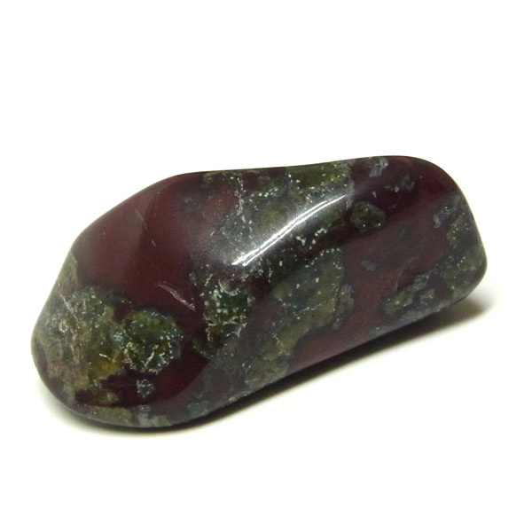 南アフリカ産のドラゴンストーン、タンブルです。現在では南アフリカまたはオーストラリアで産出される石のようです。ドラゴンストーンまたはドラゴンブラッドジャスパーと呼ばれます。これは、ドラゴンの皮膚を思わせる緑色に、ドラゴンの血をイメージさせる赤い点や筋が入っていることから名付けられています。日本ではあまり文献がないのですが基本はジャスパーだと思われます。こちらは磨いたタンブルですが、原石の状態ですとドラゴン模様の緑の石に本当にドラゴンの血が付いたのではと思わせられます。見た目は綺麗というよりは力強くかっこいい石です。
