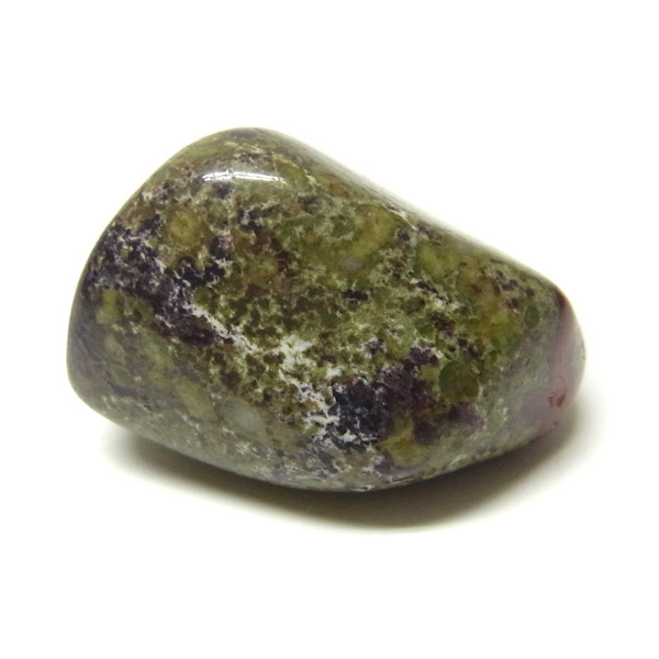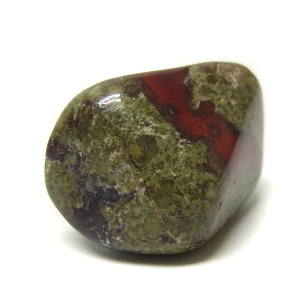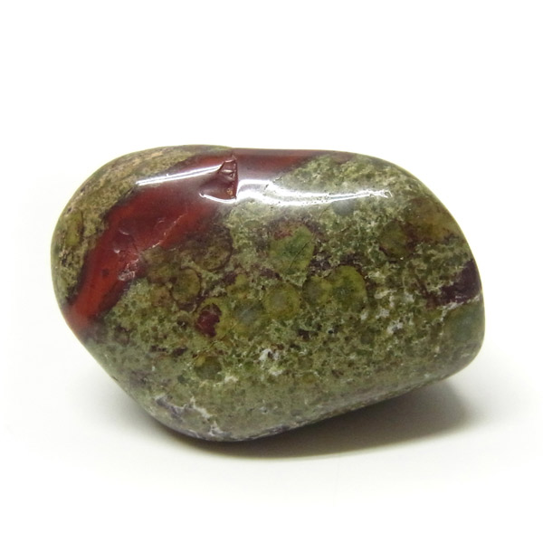 南アフリカ産のドラゴンストーン、タンブルです。現在では南アフリカまたはオーストラリアで産出される石のようです。ドラゴンストーンまたはドラゴンブラッドジャスパーと呼ばれます。これは、ドラゴンの皮膚を思わせる緑色に、ドラゴンの血をイメージさせる赤い点や筋が入っていることから名付けられています。日本ではあまり文献がないのですが基本はジャスパーだと思われます。こちらは磨いたタンブルですが、原石の状態ですとドラゴン模様の緑の石に本当にドラゴンの血が付いたのではと思わせられます。見た目は綺麗というよりは力強くかっこいい石です。
