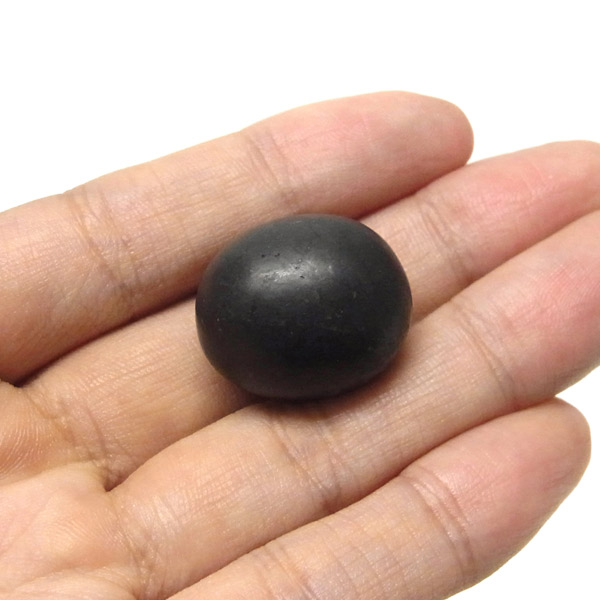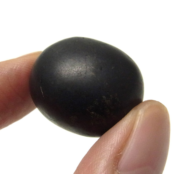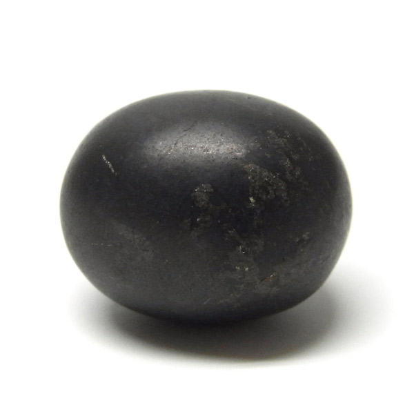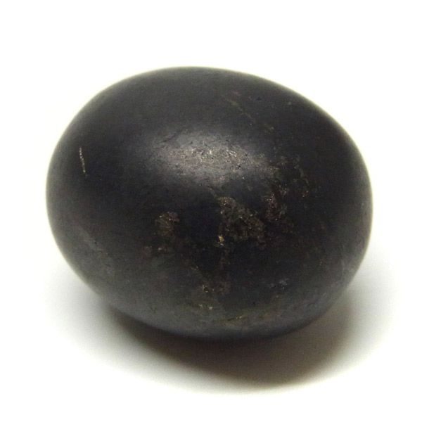 ロシア・カレリア産のシュンガイト、タンブルです。所々に金色のキラキラしたパイライトが見られます。
