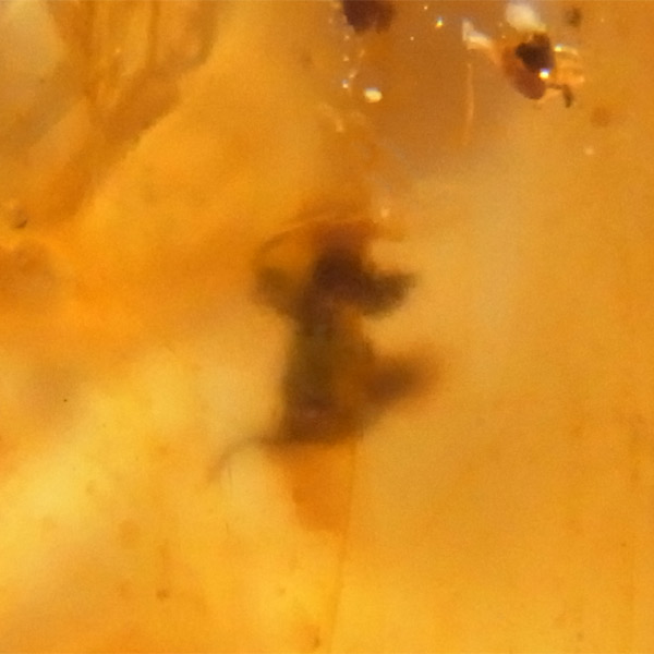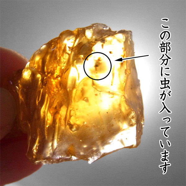コロンビア産で、蜂蜜色の透明度の高い琥珀に4mmほどの虫が一匹存在する「虫入り琥珀」です。