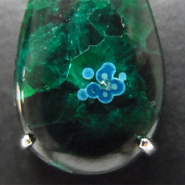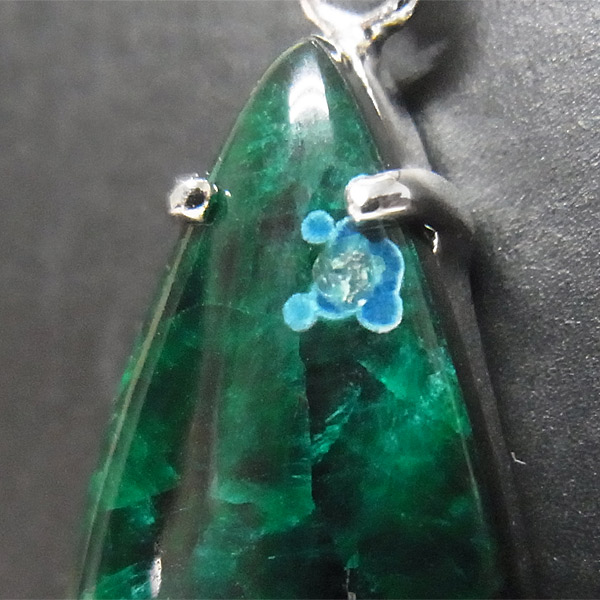 深く鮮やかなグリーンのダイオプテーズの中に、パッと花が咲いたようなシャッタカイトが共生している、とても可愛らしくしかも上品なペンダントトップです。