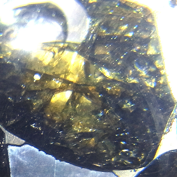銀色部分が鉄ニッケル合金などで、茶〜深い緑の部分がペリドットですが、これを光に透かすとまるでステンドグラスのように美しく輝きます。