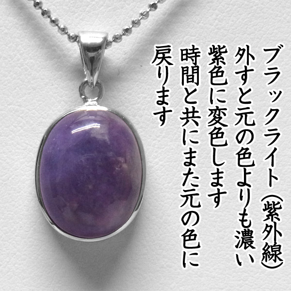 ハックマナイトは、ソーダライトの塩素成分のごく一部が硫黄に置き換えられた変種で、レアストーンのひとつです。方ソーダ石の構成成分に含まれる硫黄成分が、紫外線を吸収して薄い紫〜濃い紫〜ピンク〜赤などに変色する不思議な石です。紫外線を吸収することによって色が変わり、紫外線が当たらない環境では自然に元の色に戻り、この現象は何度でも繰り返されます。