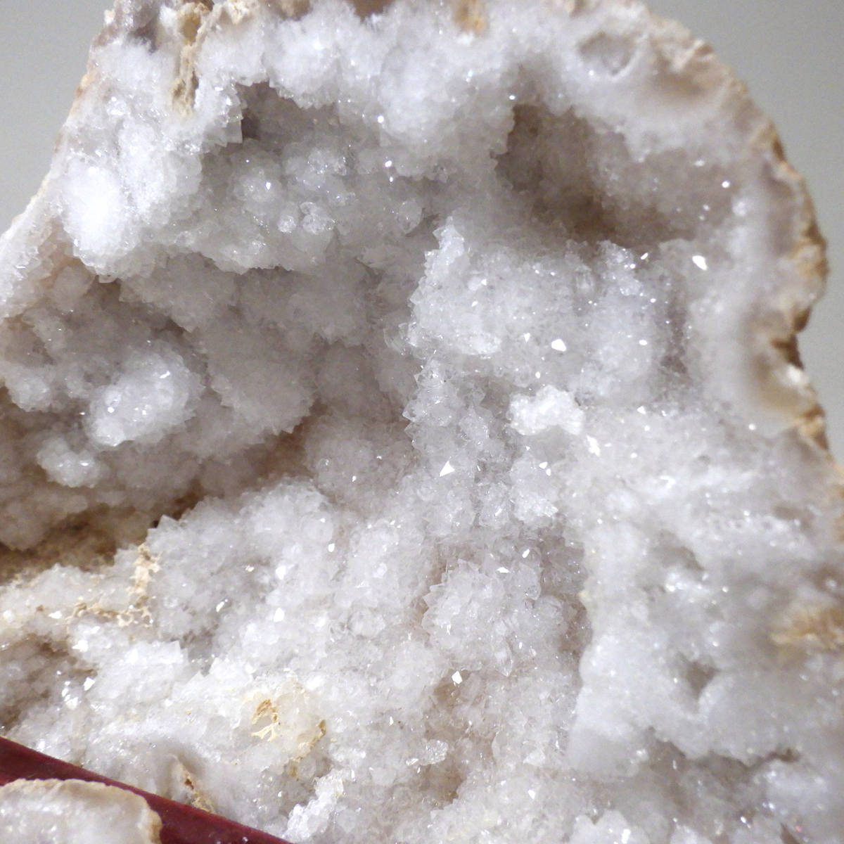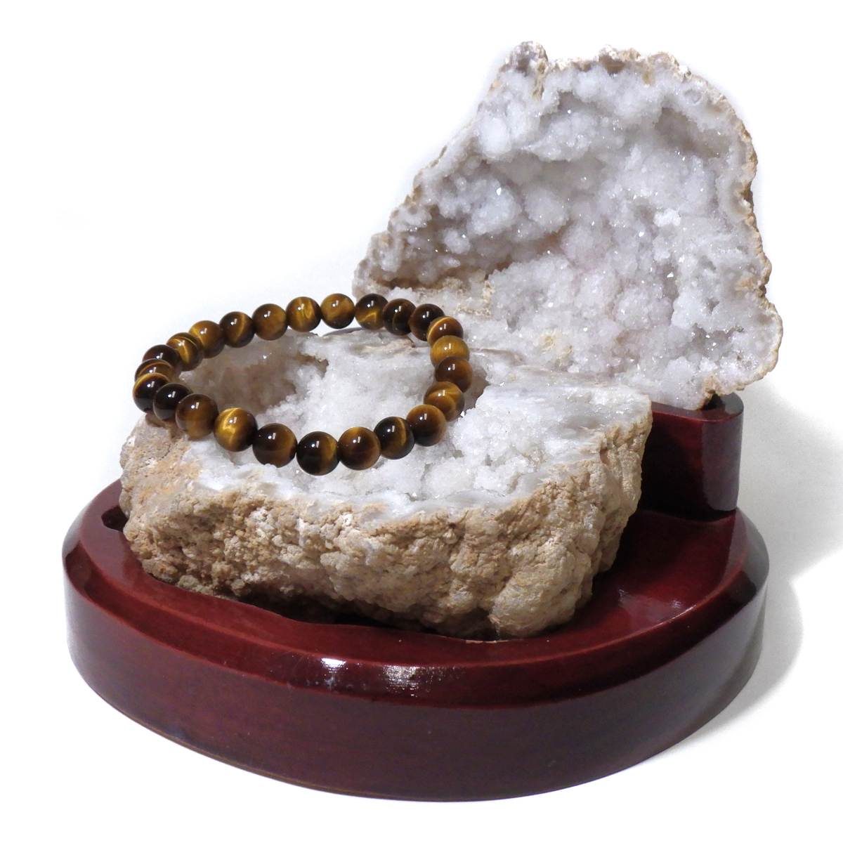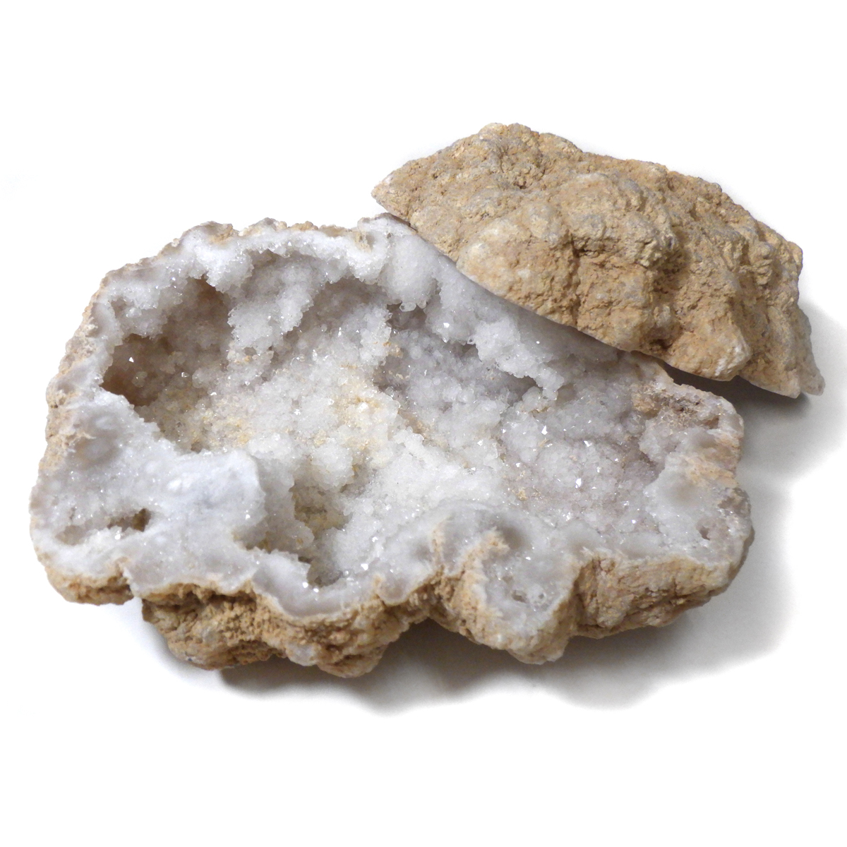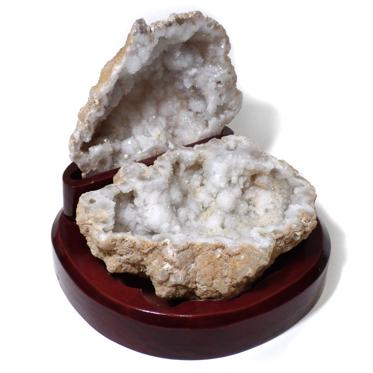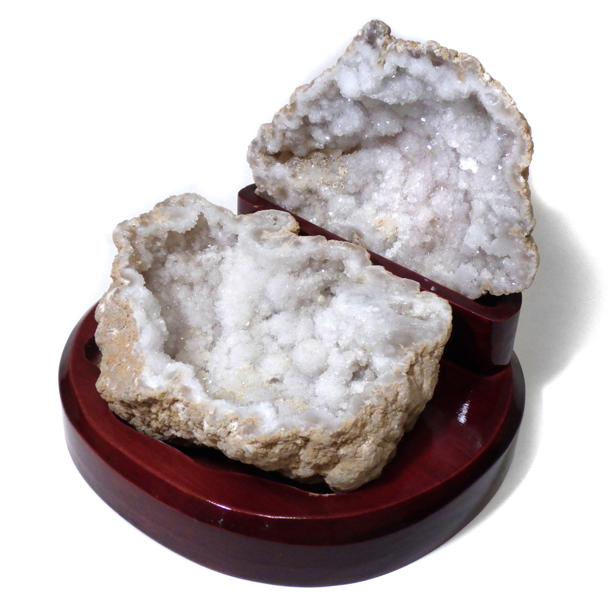 メノウの原石を2つに切ったもので、中には天然の水晶結晶等がきれいに並んでいます。良い気を集めて、パワーを蓄積するといわれています。