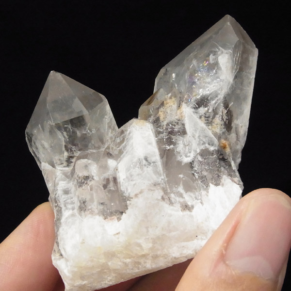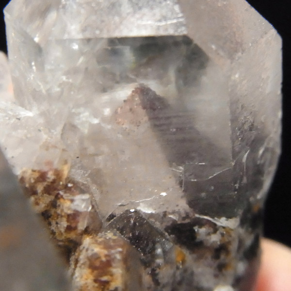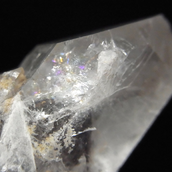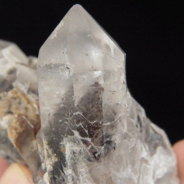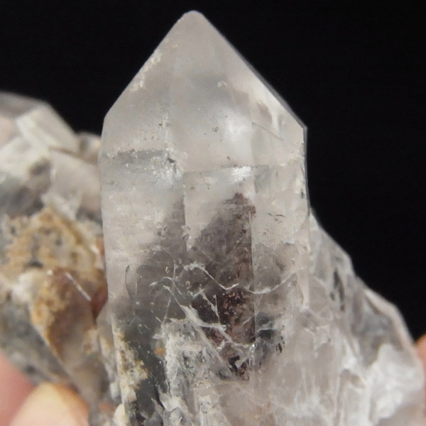 インド・アーンドラ・プラデーシュ州グントゥール産のブラックファントムクォーツです。この希少水晶に内包されております、ブラックファントムは、ヘマタイトの付着によるものです。透明度はやや低いのですがはっきりと山型のブラックファントムの模様が確認できます。また、レインボーが一部見られます。ポイントが2つある水晶自体の形も良く、ヘマタイトの煌めきもかっこいい水晶です。