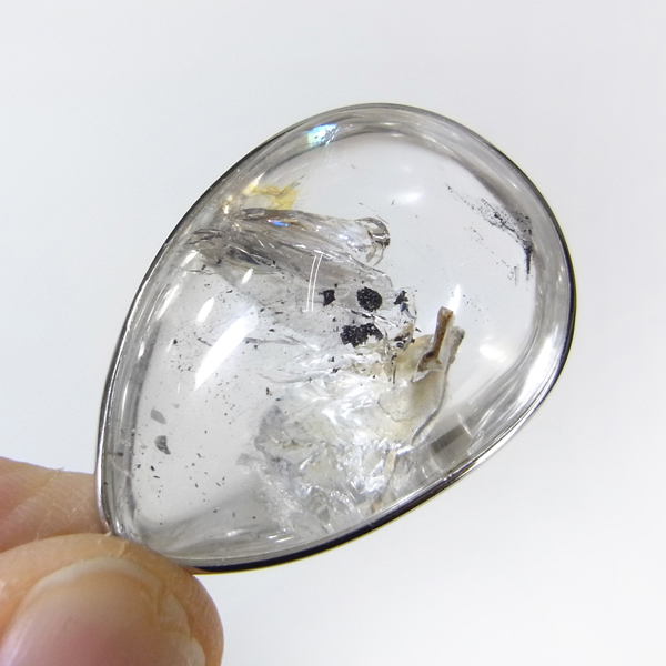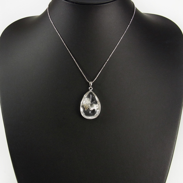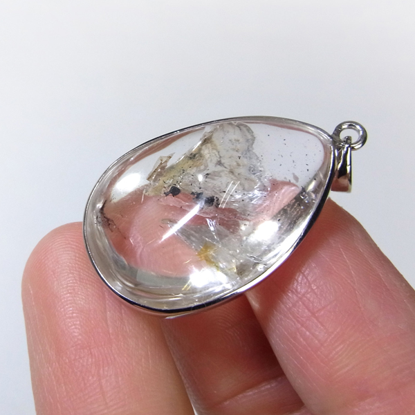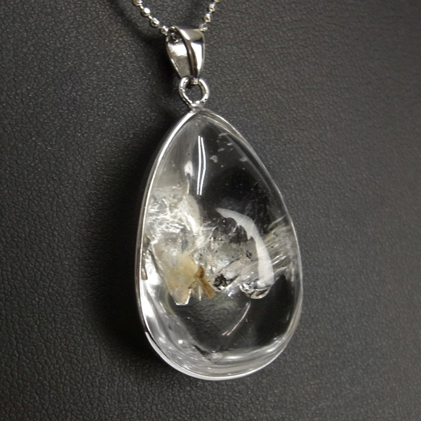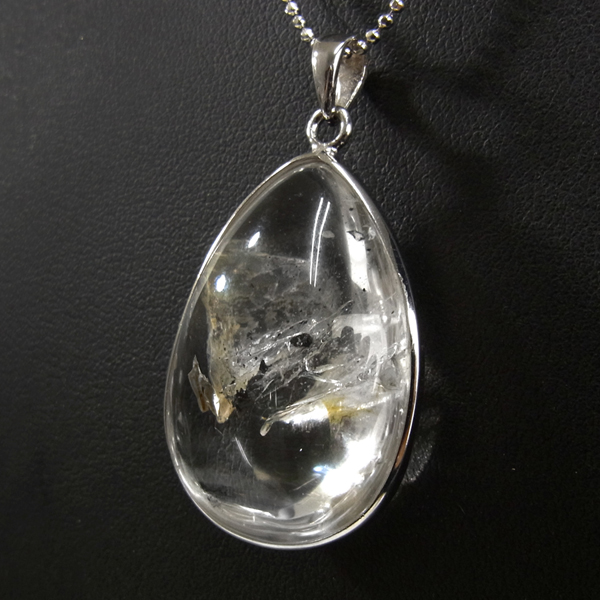 ブラジル産の大変透明度の高い水入り水晶のペンダントトップです。水入り水晶は名称の通り水晶の中に水が閉じ込められており、幸運を招く石といわれています。大変透明度が高く、コロンとかわいい水の塊が確認できます。左右に動かすと水と内包物が動くのが分かります。黒い内包物(おそらくグラファイト)が動く様子を動画にしております。揺らすと一瞬見えるレインボーもワンポイントでGoodです。かわいい雰囲気をそのままにしずく形のペンダントトップに加工しています。