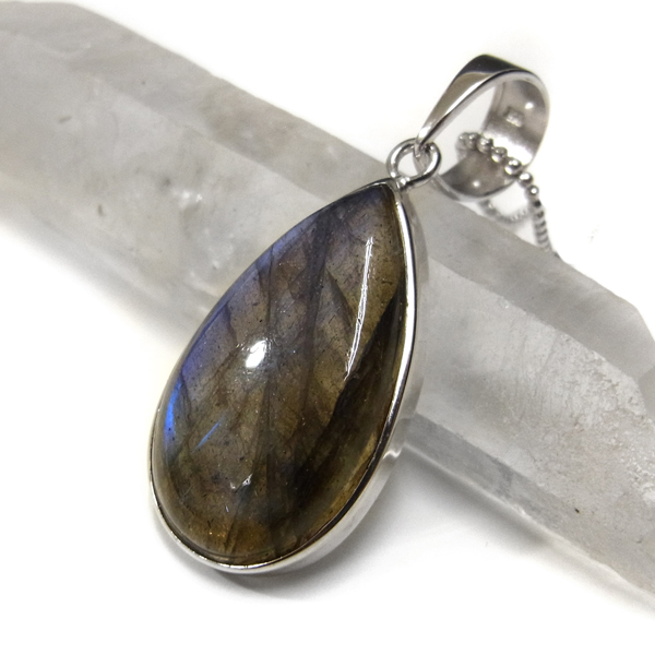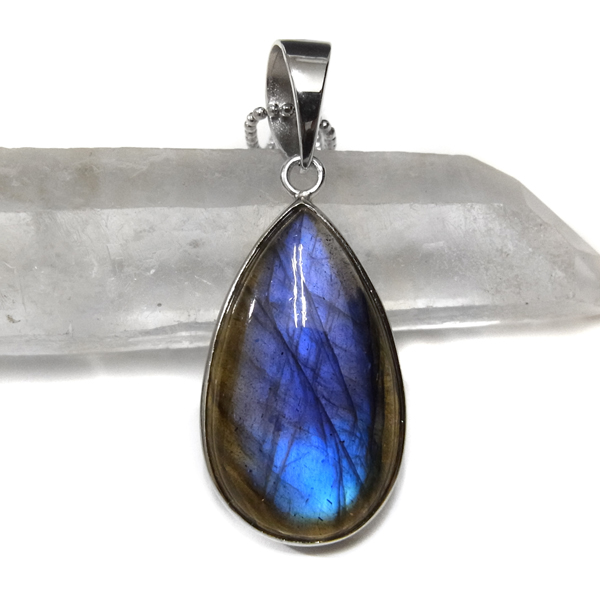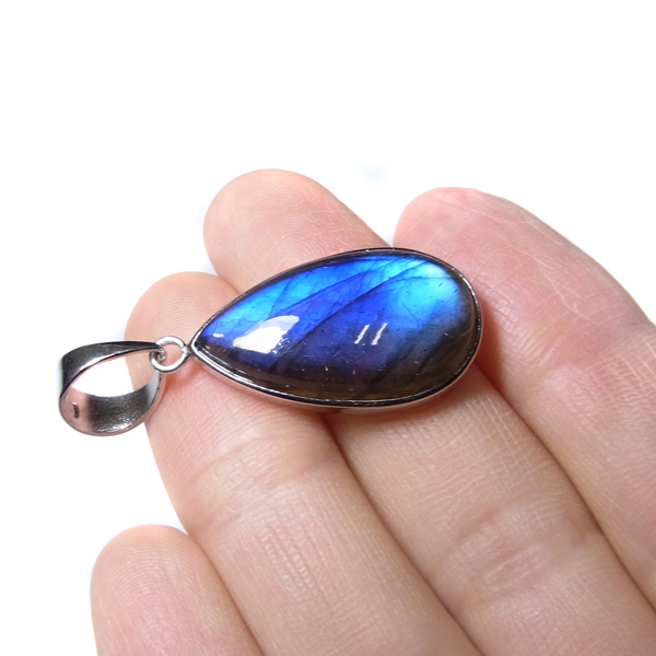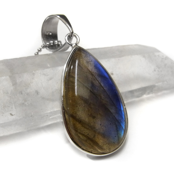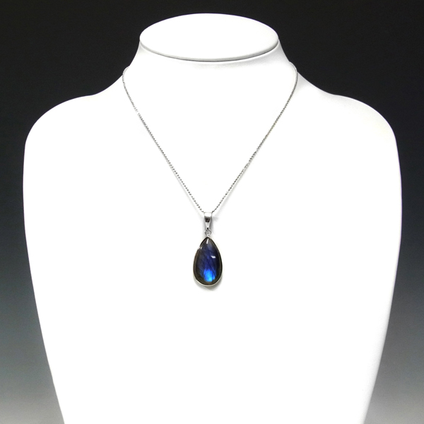 マダガスカル産ラブラドライトのペンダントトップです。ブルーのラブラドレッセンスが見られます。よく見ると小さな内包物が星のようにキラキラと見られ、全体としてラブラドライトの大きな深みを感じます。石の加工はしずく形に艶やかな研磨を施しております。胸元で魅惑のラブラドレッセンスがしっかりと輝きます。