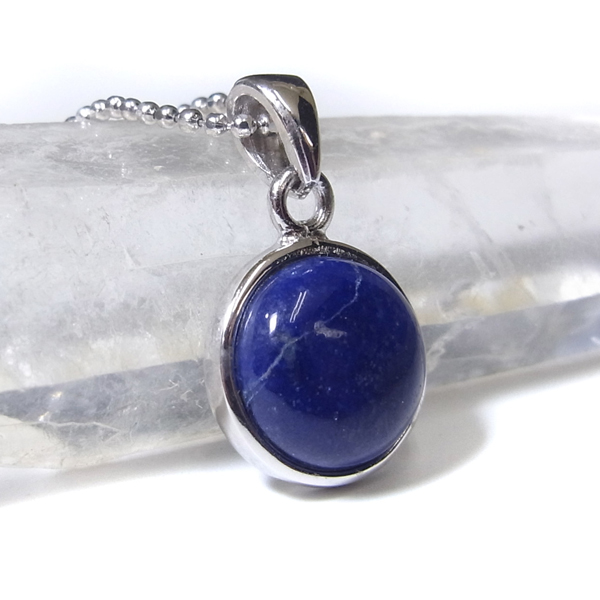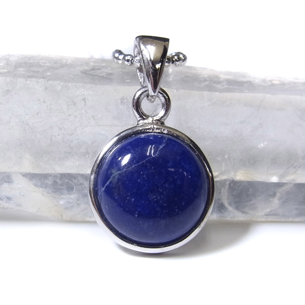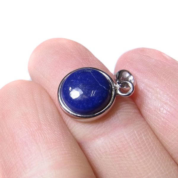 アフガニスタン産のラピスラズリ、ペンダントトップです。形は丸型でかわいらしいサイズ。ラピスラズリは、ラズライト・アウィン・ソーダライト・ノーゼライトが集合したものです。特に、ラズライトとノーゼライトを多く含有すると、深く美しい色彩のラピスラズリとなります。全体的に、均一な色彩のものは少ないのですが、特に良い面をペンダントトップの表面にくるように加工しております。これぞラピスラズリというようなウルトラマリンブルーの品質の良いスペシャルピースのペンダントトップです。