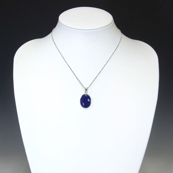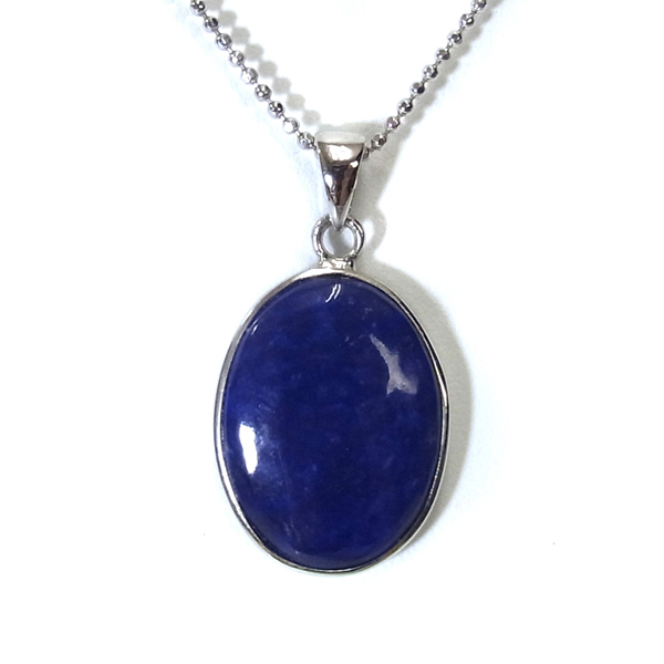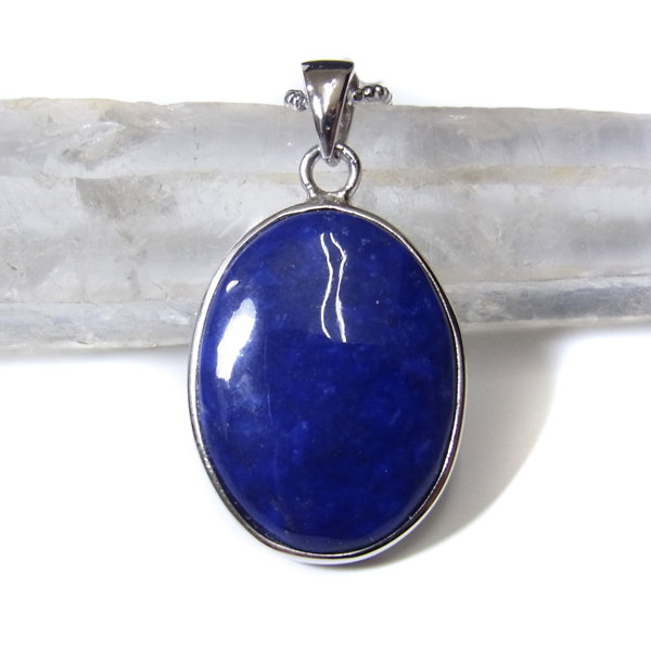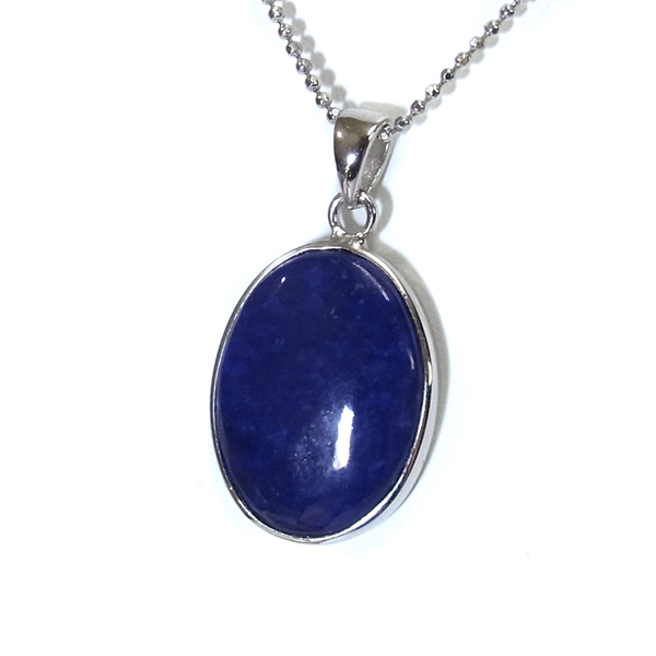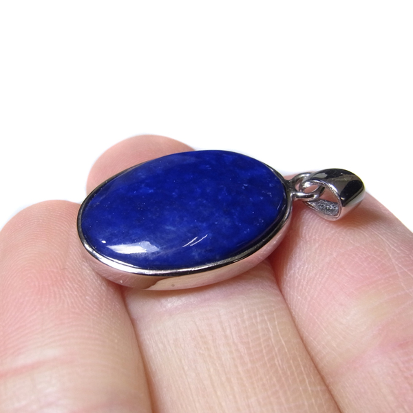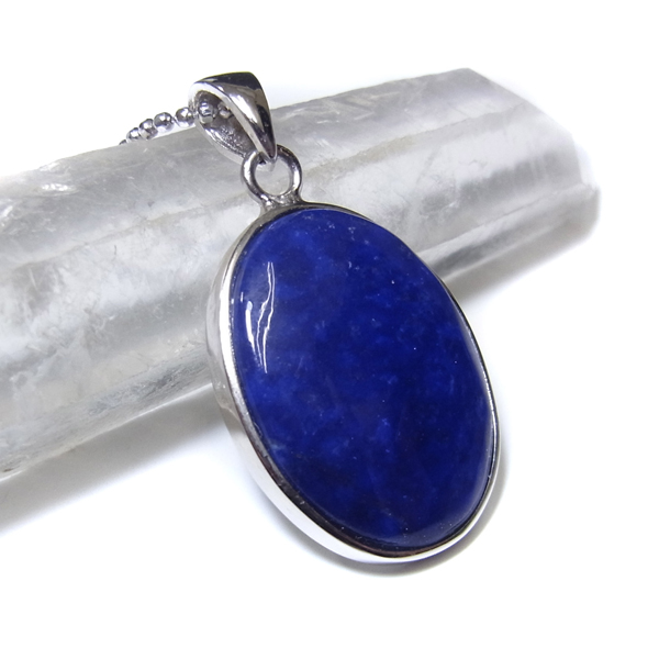 アフガニスタン産のラピスラズリ、ペンダントトップです。形はオーバル型で存在感のあるサイズ。ラピスラズリは、ラズライト・アウィン・ソーダライト・ノーゼライトが集合したものです。特に、ラズライトとノーゼライトを多く含有すると、深く美しい色彩のラピスラズリとなります。全体的に、均一な色彩のものは少ないのですが、特に良い面をペンダントトップの表面にくるように加工しております。これぞラピスラズリというようなウルトラマリンブルーの品質の良いスペシャルピースのペンダントトップです。
